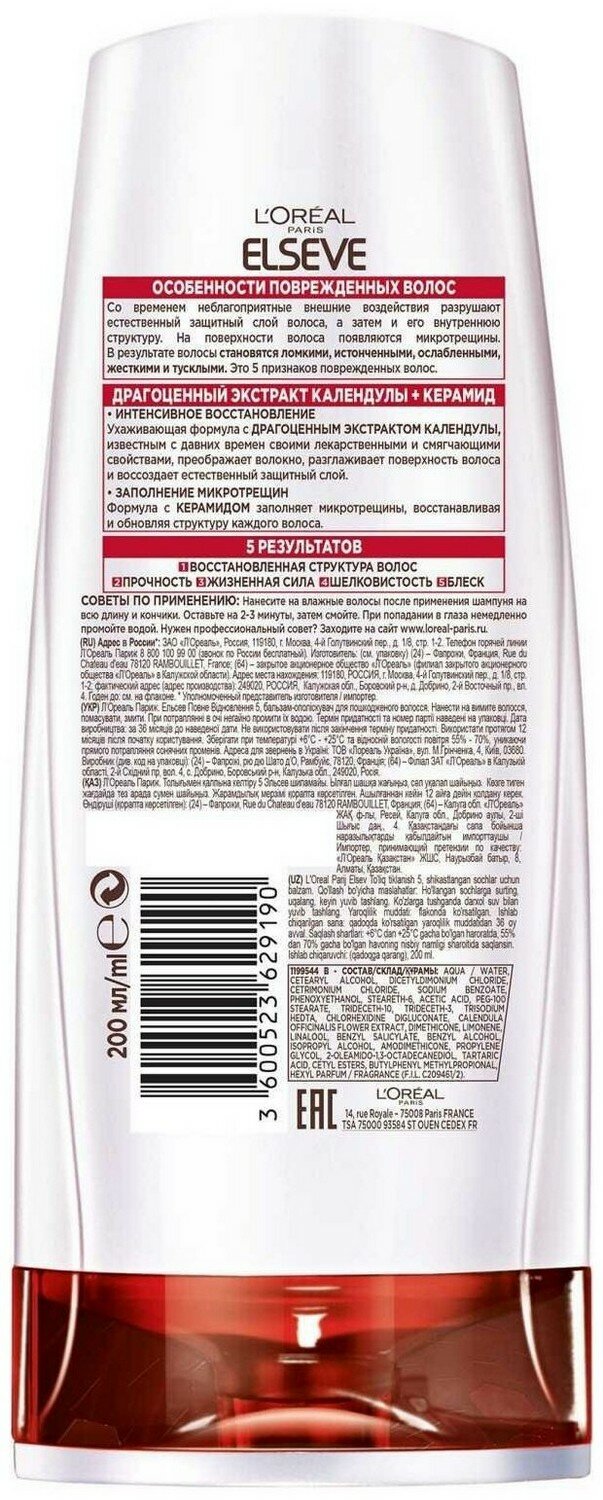 Купить L'Oreal Paris Бальзам Elseve Полное восстановление 5 Восстанавливающий Драгоценный экстракт календулы + Керамид, 200 мл - 3 шт