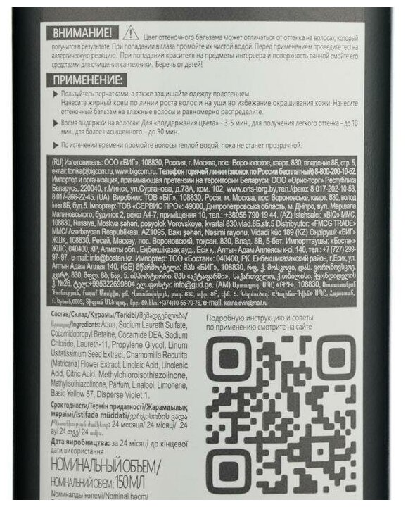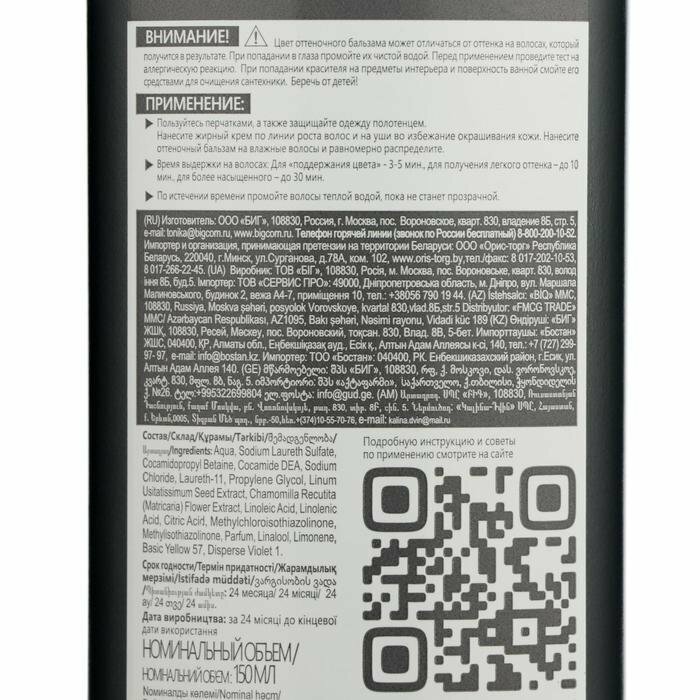 | Способ применения | нанесение Пользуйся перчатками, а также защищай одежду полотенцем. Нанеси жирный крем по линии роста волос и на уши во избежание окрашивания кожи. Нанеси оттеночный бальзам на чистые влажные волосы и равномерно распредели. Время выдержки — До 5 минут для поддержания цвета — До 10 минут для получения легкого оттенка — До 30 минут для более насыщенного оттенка. После окрашивания По истечении времени промой волосы теплой водой, пока не станет прозрачной. Закрепи полученный результат разбавленным лимонным соком (1/2 лимона на 200 мл воды) или бальзамом для окрашенных волос |
