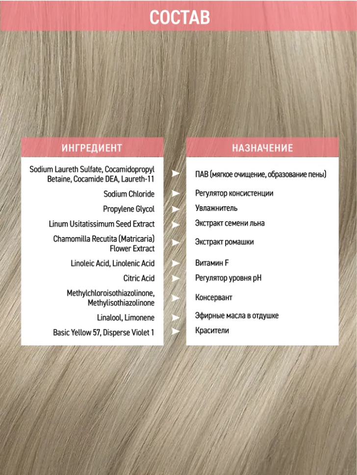 | Состав | вода специально очищенная, цетеариловый спирт, пропиленгликоль, цетримониум хлорид, цетеарет-23, пэг-40 гидрогенизированное касторовое масло peg-40, льняное масло, кондиционирующий компонент, экстракт семени льна, витамин f, кондиционирующий компонент, кислота лимонная, отдушка, метилхлороизотиазолинон e, метилизотиазолинон p, компонент отдушки, компонент отдушки, краситель |