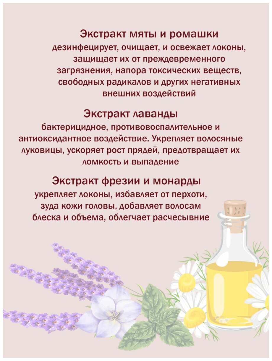 | Масла и экстракты | комплекс экстрактов / масло розмарина / экстракт лаванды / экстракт монарды / экстракт мяты / экстракт розмарина / экстракт ромашки / экстракт фрезии |
