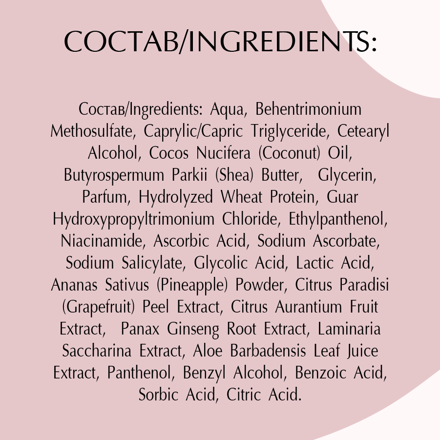 | Состав | Aqua, Panax Ginseng Root Extract, laminaria Saccarina Extract Behentrimonium Methosulfate, Caprylic/Capric Triglyceride, Cetearyl Alcohol, Cocos Nucifera (Coconut) Oil, Butyrospermum Parkii (Shea) Butter, Glycerin, Cymbopogon Сitratus (Lemongrass) Essential Oil, Hydrolyzed Wheat Protein, Guar Hydroxypropyltrimonium Chloride, Ethylpanthenol, Niacinamide, Ascorbic Acid, Sodium Ascorbate, Sodium Salicylate, Glycolic Acid, Lactic Acid, Ananas Sativus (Pineapple) Powder, Citrus Paradisi (Grapefruit) Peel Extract, Citrus Aurantium Fruit Extract, Aloe Barbadensis Leaf Juice Extract, Panthenol, Benzyl Alcohol, Benzoic Acid, Sorbic Acid, Citric Acid |