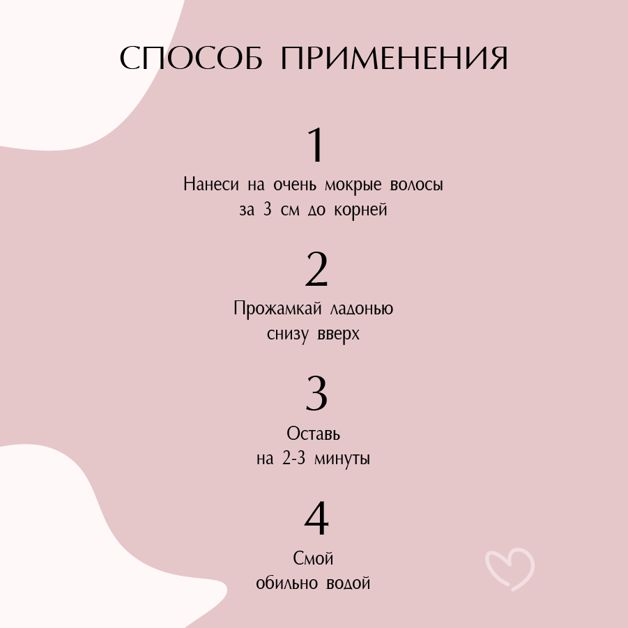 | Способ применения | Нанести на чистые, очень мокрые волосы за 3 см до корней, прожамкать ладонью снизу вверх, оставить на 2-3 минуты, смыть |