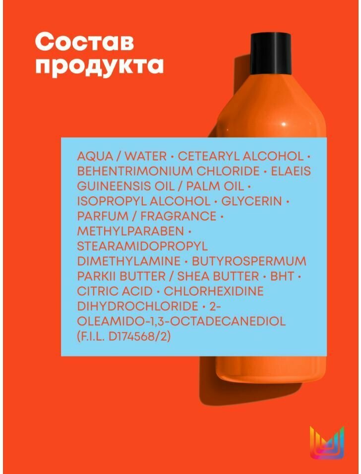 | Состав | aqua, cetearyl alcohol, behentrimonium chloride, elaeis guineensis oil/palm oil, isopropyl alcohol, parfum, glycerin, methylparaben, stearamidopropyl dimethylamine, bht, butyrospermum parkii butter/shea butter, citric acid, chlorhexidine dihydrochloride, 2-oleamido-1,3-octadecanediol |