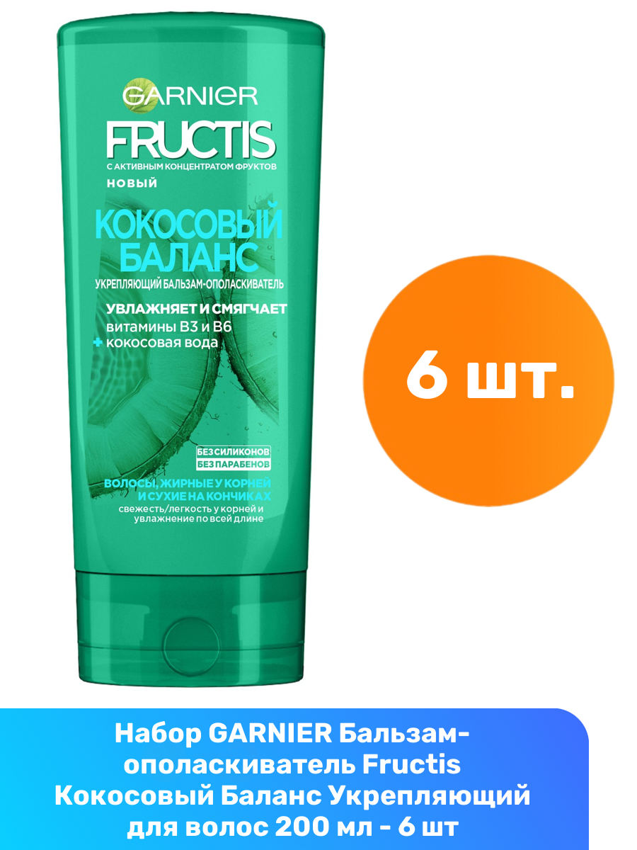 Купить GARNIER Бальзам-ополаскиватель Fructis Кокосовый Баланс Укрепляющий для волос жирных у корней и сухих на кончиках 200 мл - 6 шт