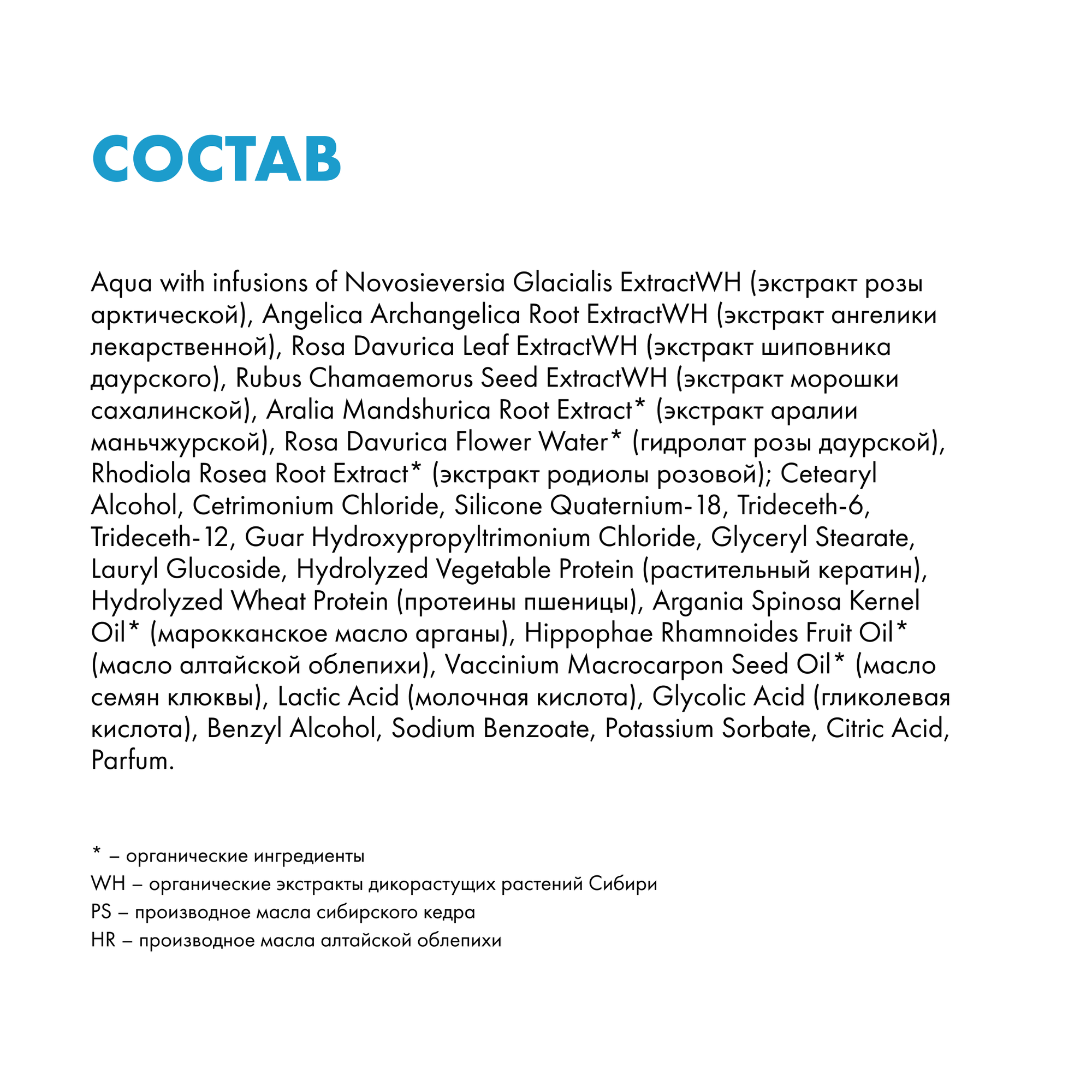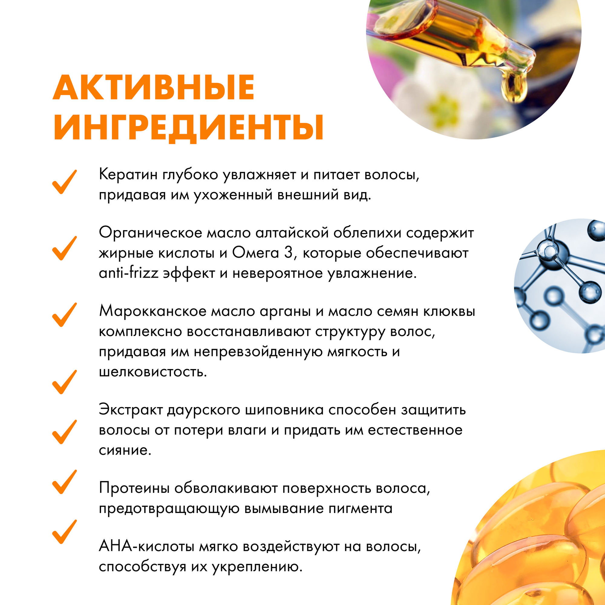 | Состав | Cetearyl Alcohol, Cetrimonium Chloride, Silicone Quaternium-18, Trideceth-6, Trideceth-12, Guar Hydroxypropyltrimonium Chloride, Glyceryl Stearate, Lauryl Glucoside, Hydrolyzed Vegetable Protein (растительный кератин), Hydrolyzed Wheat Protein (протеины пшеницы), Argania Spinosa Kernel Oil (марокканское масло арганы), Hippophae Rhamnoides Fruit Oil (масло алтайской облепихи), Vaccinium Macrocarpon Seed Oil (масло семян клюквы), Lactic Acid (молочная кислота), Glycolic Acid (гликолевая кислота), Benzyl Alcohol, Sodium Benzoate, Potassium Sorbate, Citric Acid, Parfum. |