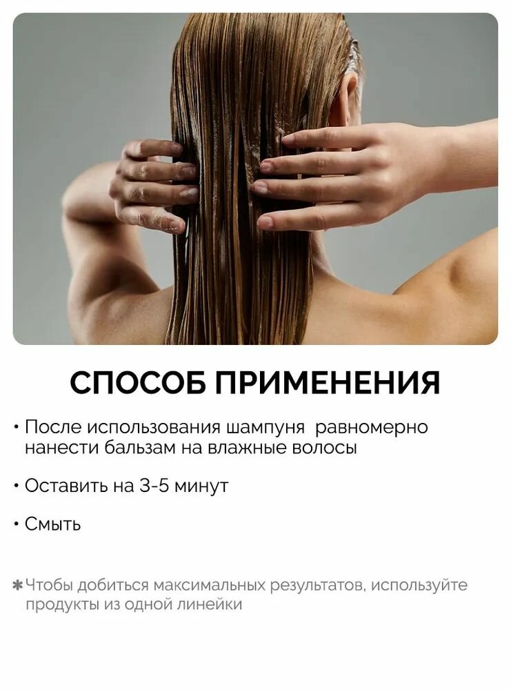 | Способ применения | На вымытые шампунем волосы нанести необходимое количество бальзама, равномерно распределить, оставить на 2-4 минуты, смыть обильным количеством теплой воды. |