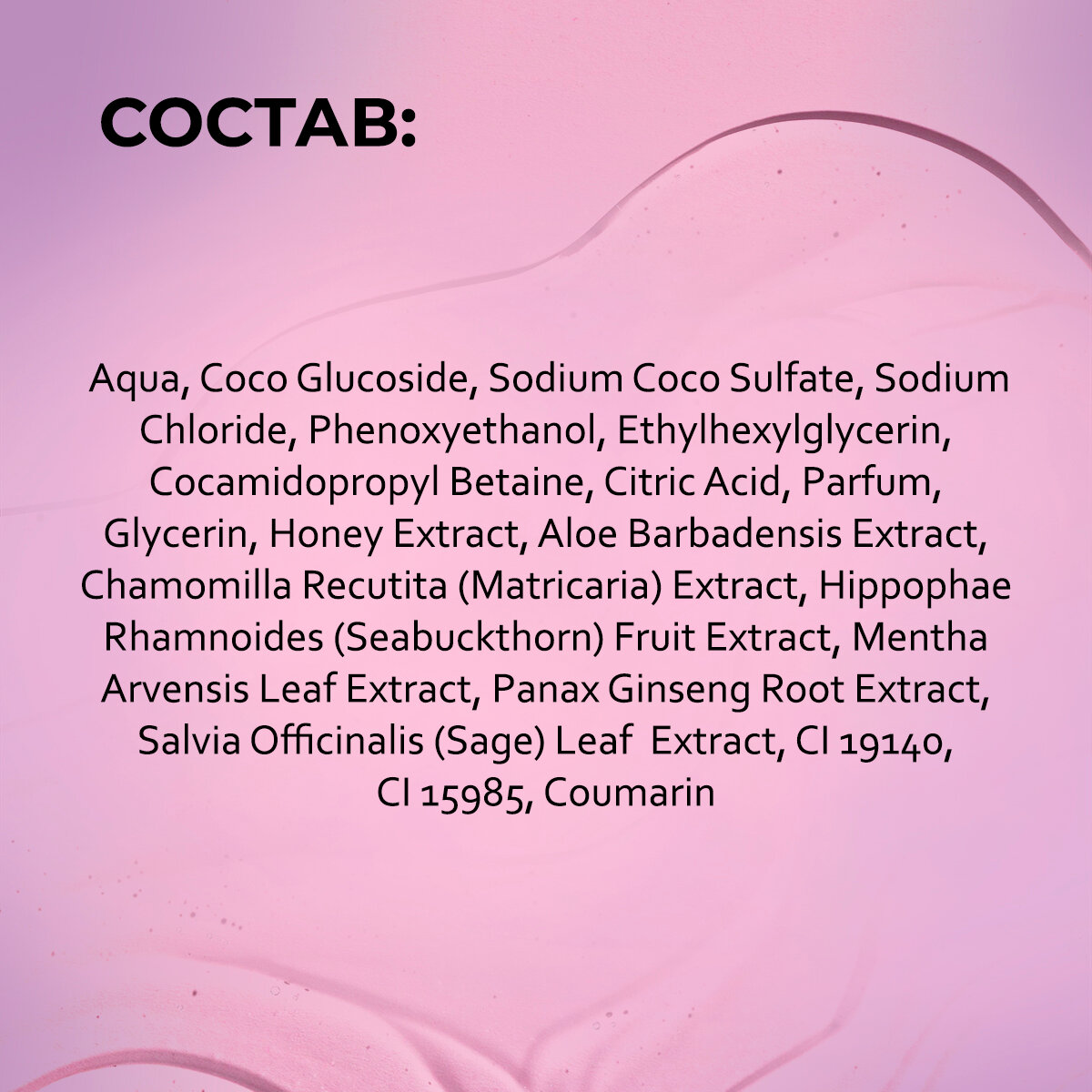| Состав | Вода, Кокосовый глюкозид, Кокосовый сульфат натрия, хлорид натрия, феноксиэтанол, этилгексилглицерин, Кокамидопропилбетаин, Лимонная кислота, Парфюмированная вода, глицерин, Экстракт меда, Экстракт Алоэ Барбадосского, Экстракт ромашки обыкновенной, Экстракт плодов облепихи, Экстракт листьев мяты обыкновенной, экстракт корня женьшеня, Шалфея лекарственного Экстракт листьев шалфея, CI 19140, CI 15985, кумарин. |