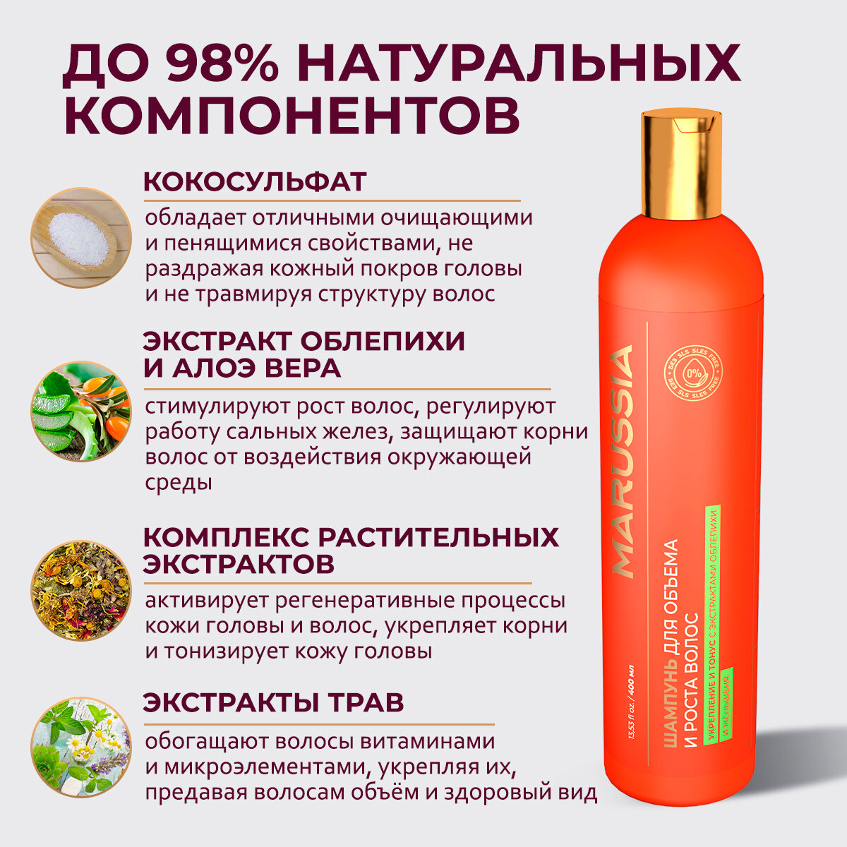 Marussia Шампунь для волос женский мужской, «Сила трав» для всех типов, с экстрактом меда, 400 мл