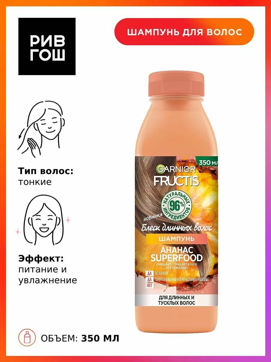Шампунь Garnier FRUCTIS Superfood Ананас, Блеск длинных волос, 350 мл
