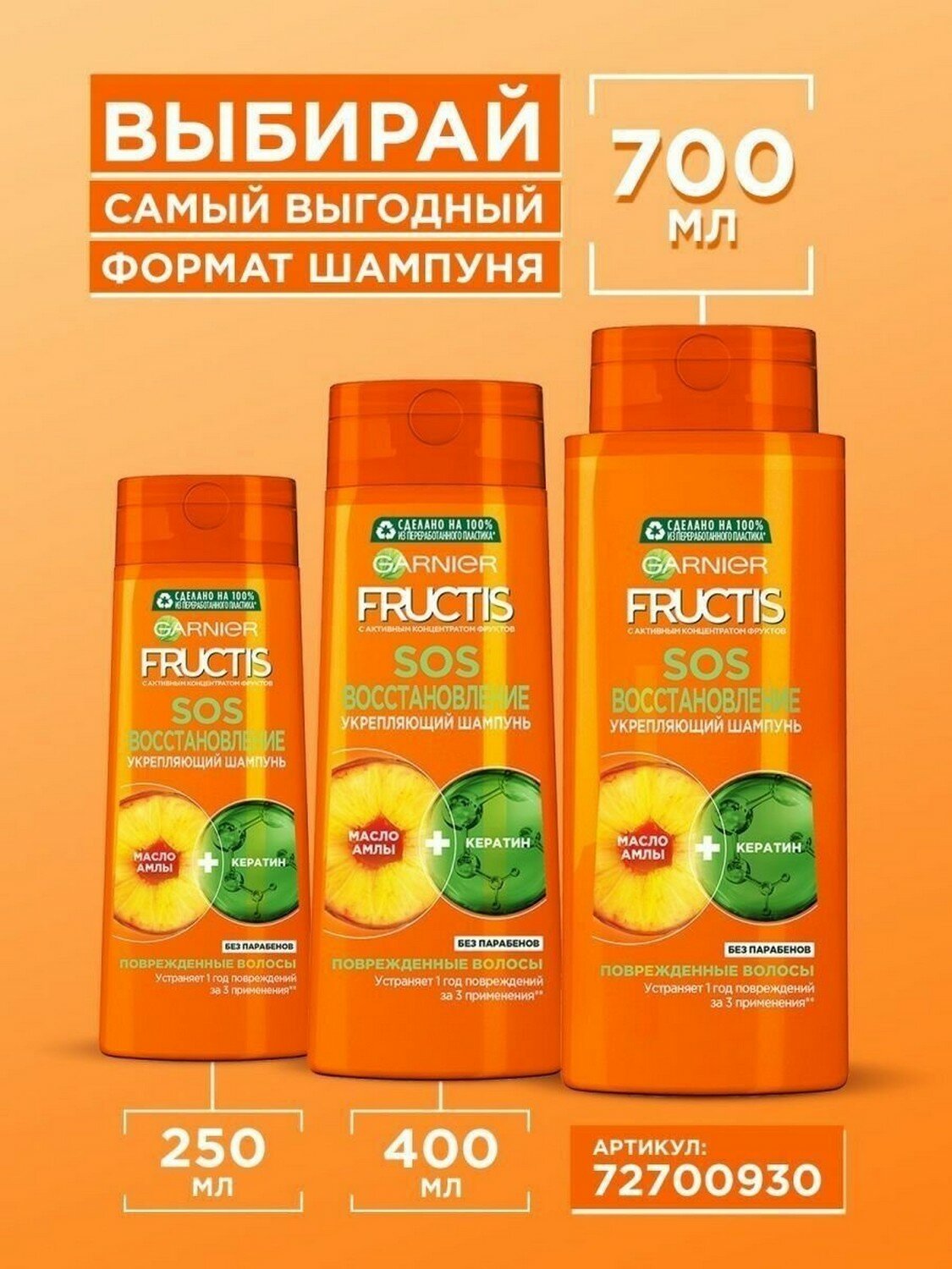 Fructis Шампунь для волос SOS Восстановление, укрепляющий, для секущихся и очень поврежденных волос, с Керафилом и Маслом Амлы, 400 мл