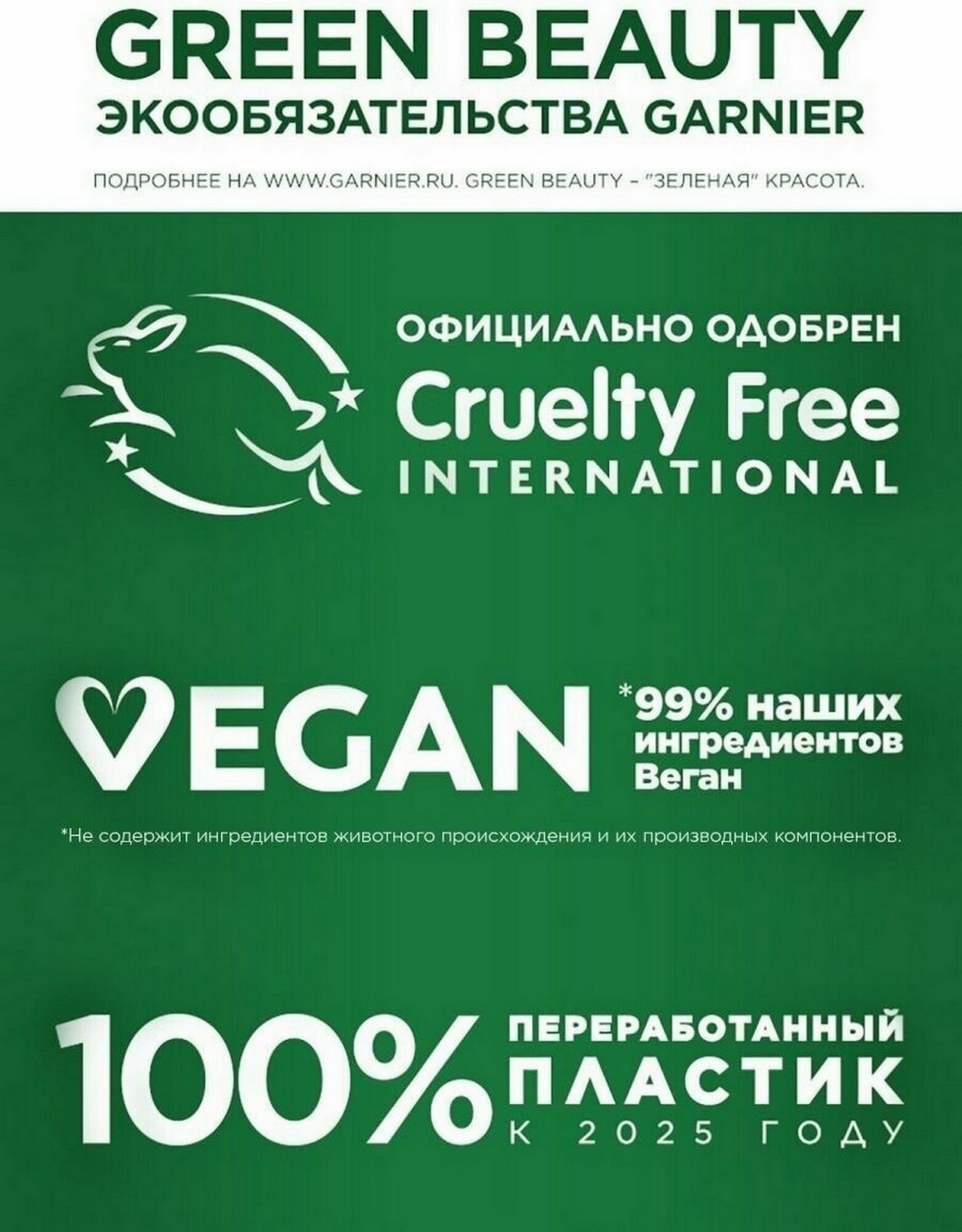 | Не содержит | ГМО / глютен / искусственных красителей / кремний / минеральных масел / отдушек / парабенов / полиэтиленгликоля / продуктов животного происхождения / пропиленгликоля / силиконов / спирт / сульфатов / фталатов |