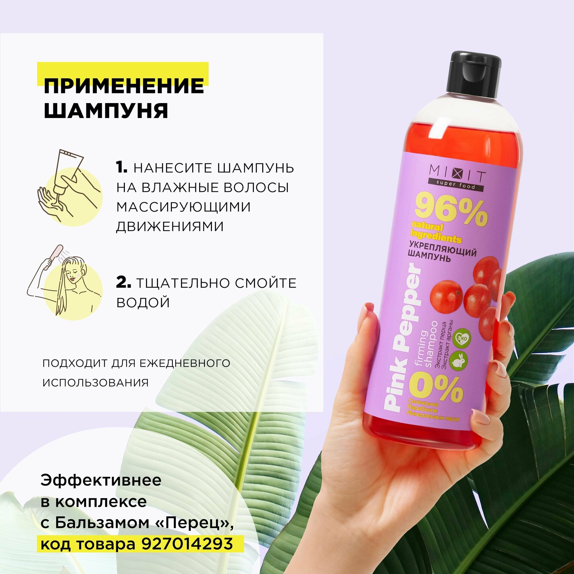 | Способ применения | Нанесите шампунь на влажные волосы массирующими движениями, тщательно смойте водой. Подходит для частого использования. Эффективнее в комплексе с питательной бaльзам-мaской 3в1 «Банан» для выпрямления и плотности волос серии MIXIT SUPER FOOT. |