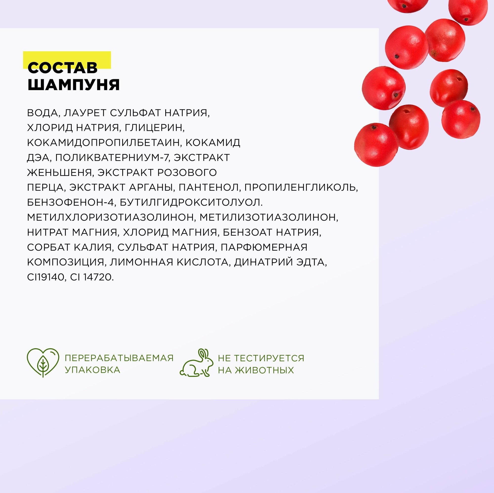 | Состав | Вода, Лауретсульфат Натрия, Хлорид натрия, Глицерин, Кокамидопропилбетаин, Кокамид DEA, Поликватерниум-7, Экстракт корня женьшеня Panax, Плоды Schinus Terebinthifolius Экстракт, Экстракт плодов Аргании колючей, Пантенол, Пропиленгликоль, Бензофенон-4, BHT, Метилхлоризотиазолинон, Метилизотиазолинон, Нитрат Магния, Хлорид магния,Бензоат натрия, Сорбат Калия, Сульфат натрия, Парфюмерная вода, Лимонная кислота, Динатриевый ЭДТА, CI 19140, CI 14720. |