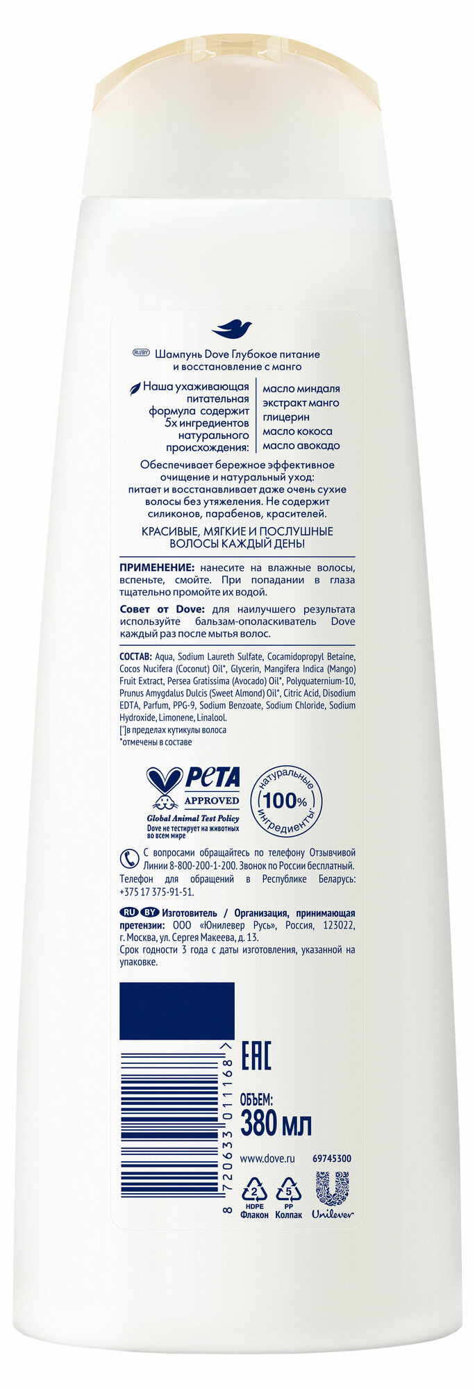 Купить Dove шампунь Глубокое питание и восстановление с ароматом Манго 380 мл