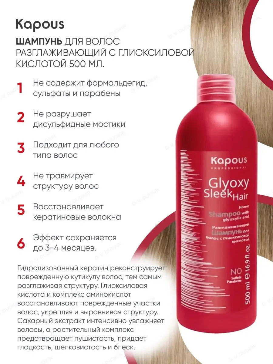 Ниже Вы можете прочитать отзывы на Бессульфатный шампунь разглаживающий с глиоксиловой кислотой Kapous «GlyoxySleek Hair», 500 мл, ознакомится с подробными характеристиками, посмотреть интересные обзоры и фотографии на Бессульфатный шампунь разглаживающий с глиоксиловой кислотой Kapous «GlyoxySleek Hair», 500 мл.
