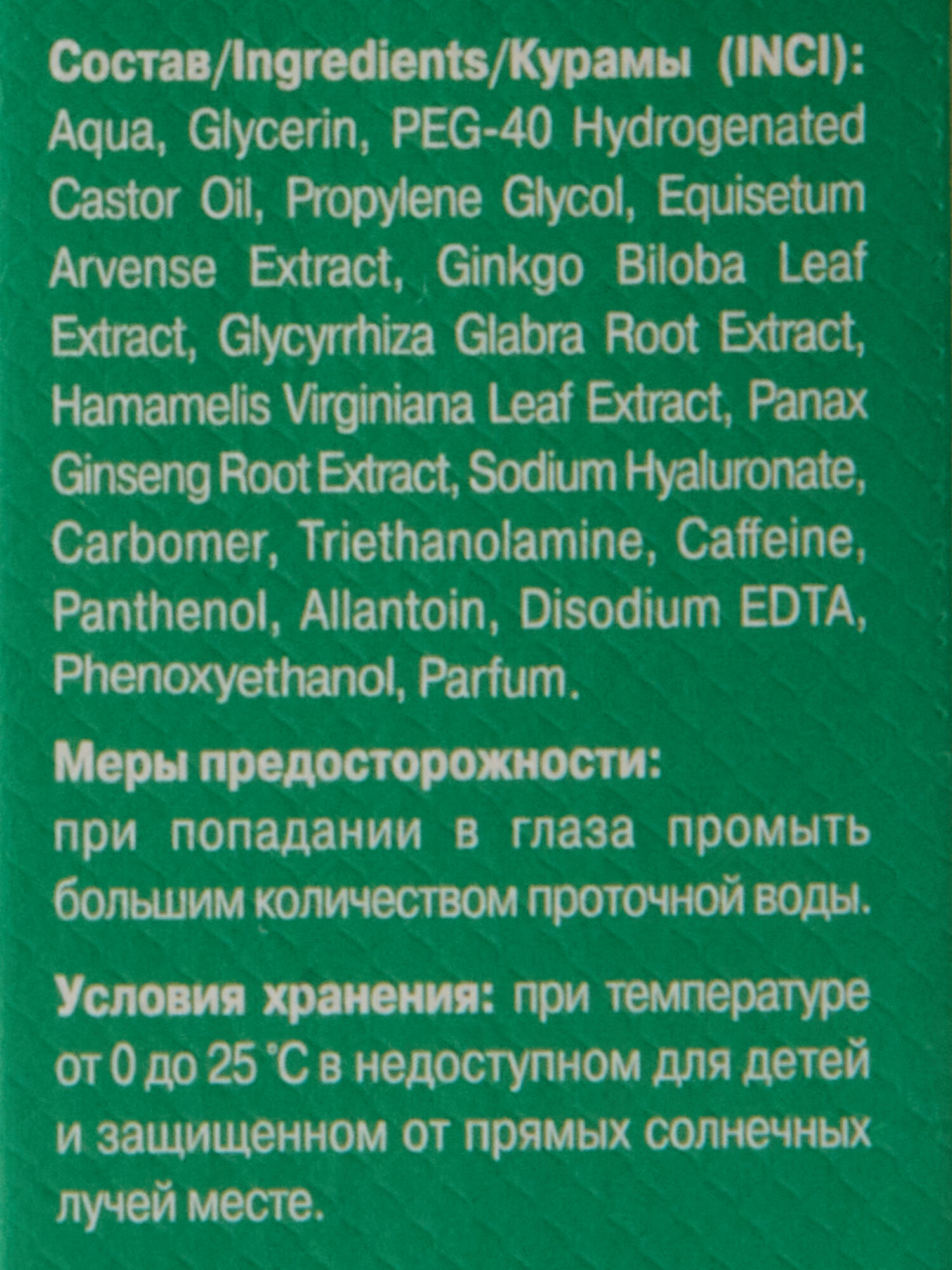 | Состав | вода, глицерин, ПЭГ-40 гидрогенизированное касторовое масло, пропиленгликоль, экстракт хвоща |