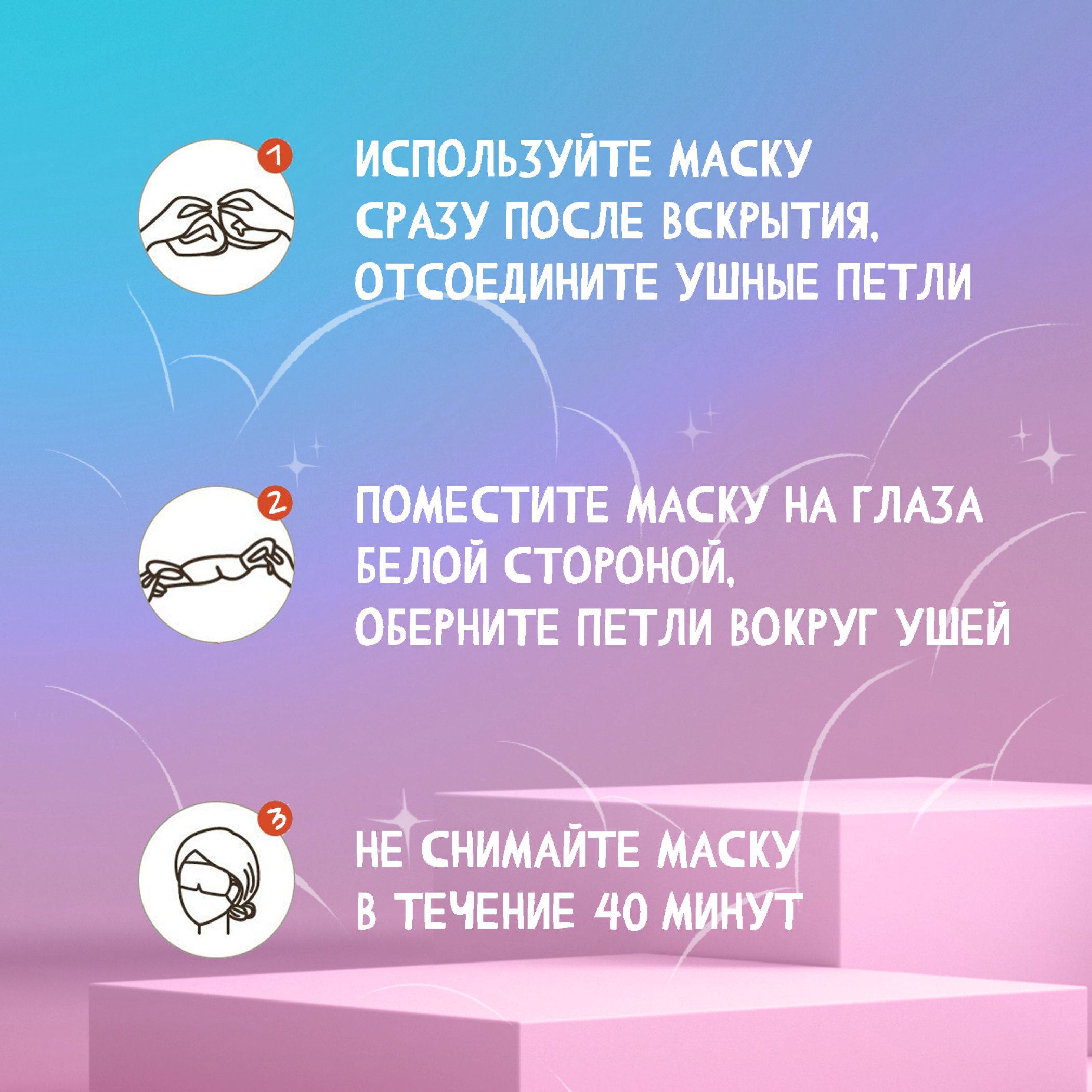 | Способ применения | Способ применения: откройте упаковку и выньте маску для глаз; разорвите ушные петли по пунктирной линии и наденьте маску; при использовании закройте глаза пока выделяется тепло (в среднем 30 минут) , а затем снимите маску для глаз. После извлечения паровая маска для глаз нагревается автоматически в течение 3-4 минут до 40 С. |
