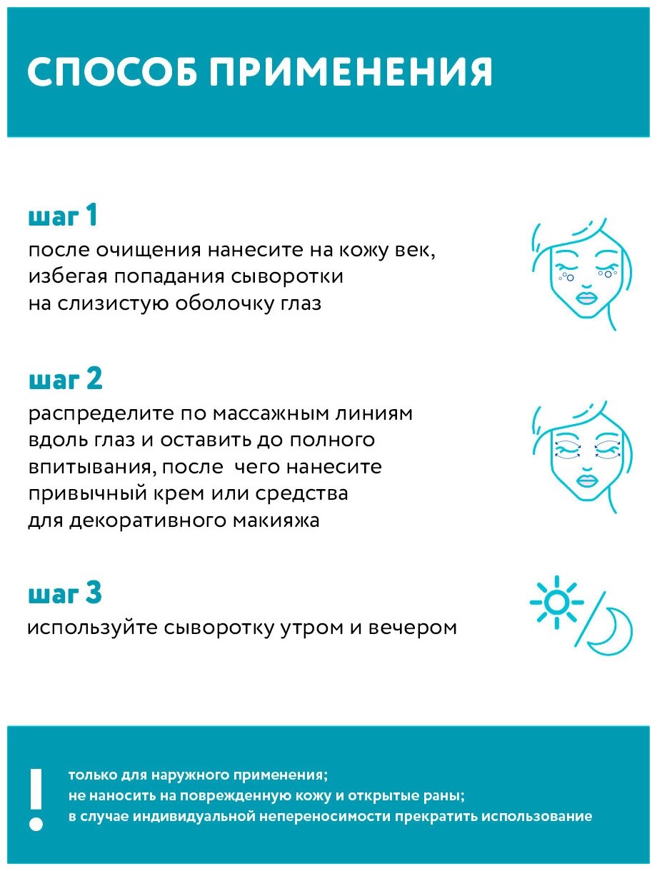 | Способ применения | после очищения нанести на кожу век. Избегая попадания сыворотки на слизистую оболочку глаз. Распределить по массажным линиям вдоль глаз и оставить до полного впитывания, после чего нанесите привычный крем или средства для декоративного макияжа. Используйте сыворотку утром и вечером. |