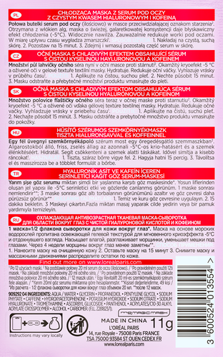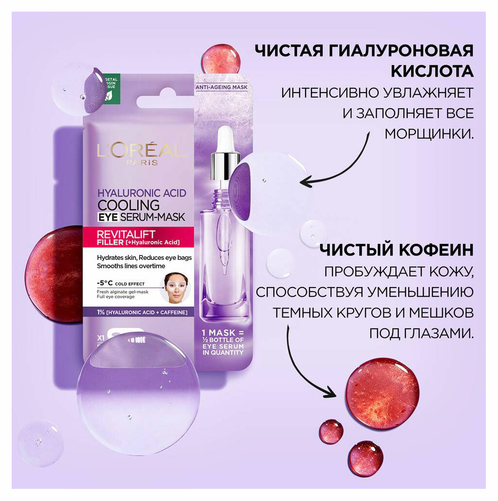 L'Oreal Paris Охлаждающая Тканевая маска-сыворотка для области вокруг глаз Ревиталифт Филлер, с чистой гиалуроновой кислотой и кофеином, 11 г интересное:
