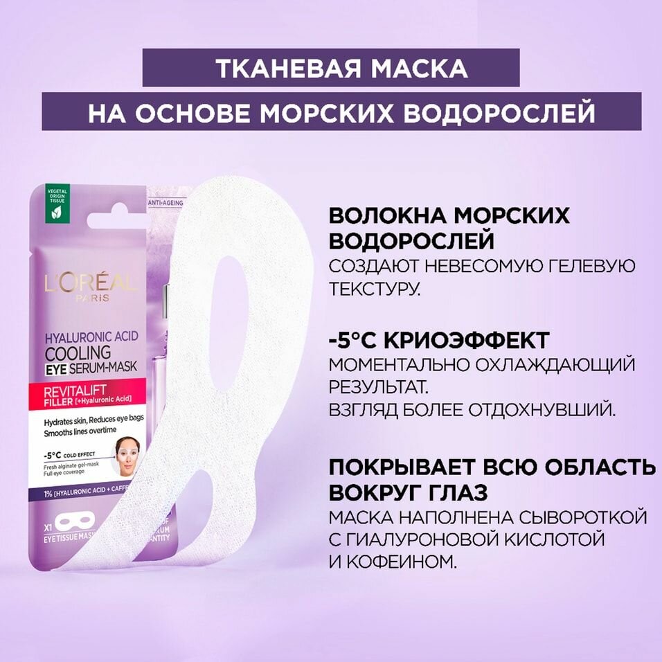Купить L'Oreal Paris Охлаждающая Тканевая маска-сыворотка для области вокруг глаз Ревиталифт Филлер, с чистой гиалуроновой кислотой и кофеином, 11 г