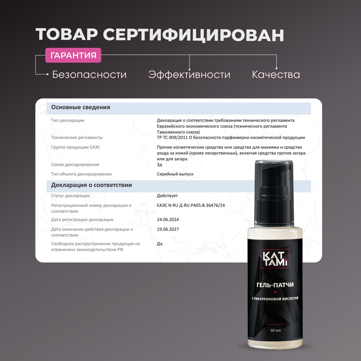 | Способ применения | 1. нанести гелевые патчи на зону вокруг глаз 2. оставить на 15-20 минут 3. по желанию распределить остатки средства похлопывающими движениями или снять салфеткой |