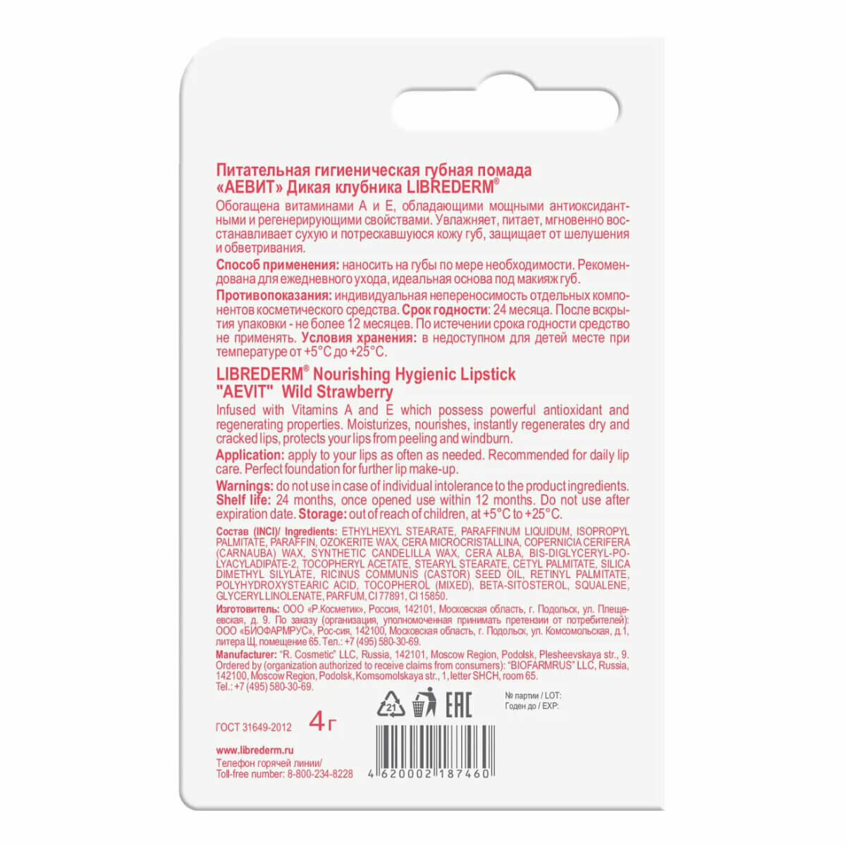 LIBREDERM аевит Гигиеническая помада для губ питательная Дикая клубника 4 г
