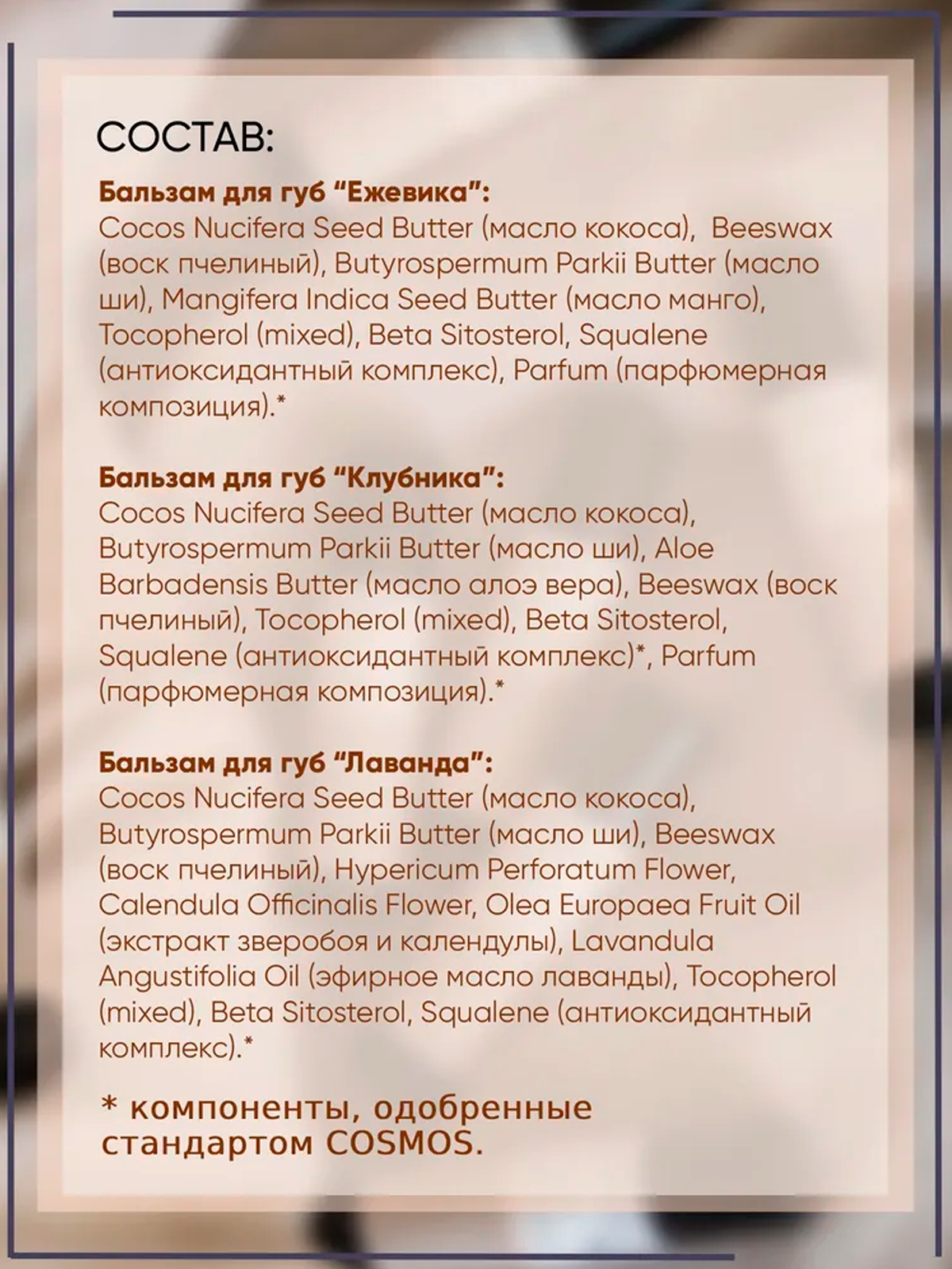 | Состав | Cocos Nucifera Seed Butter (масло кокоса), Butyrospermum Parkii Butter (масло ши), Mangifera Indica Seed Butter (масло манго), Beeswax (воск пчелиный), Camellia Sinensis Leaf (чай матча), Mentha Piperita Oil (эфирное масло мяты), Litsea Cubeba Fruit Oil (эфирное масло литсея кубеба) Tocopherol (mixed), Beta Sitosterol, Squalene (антиоксидантный комплекс). |
