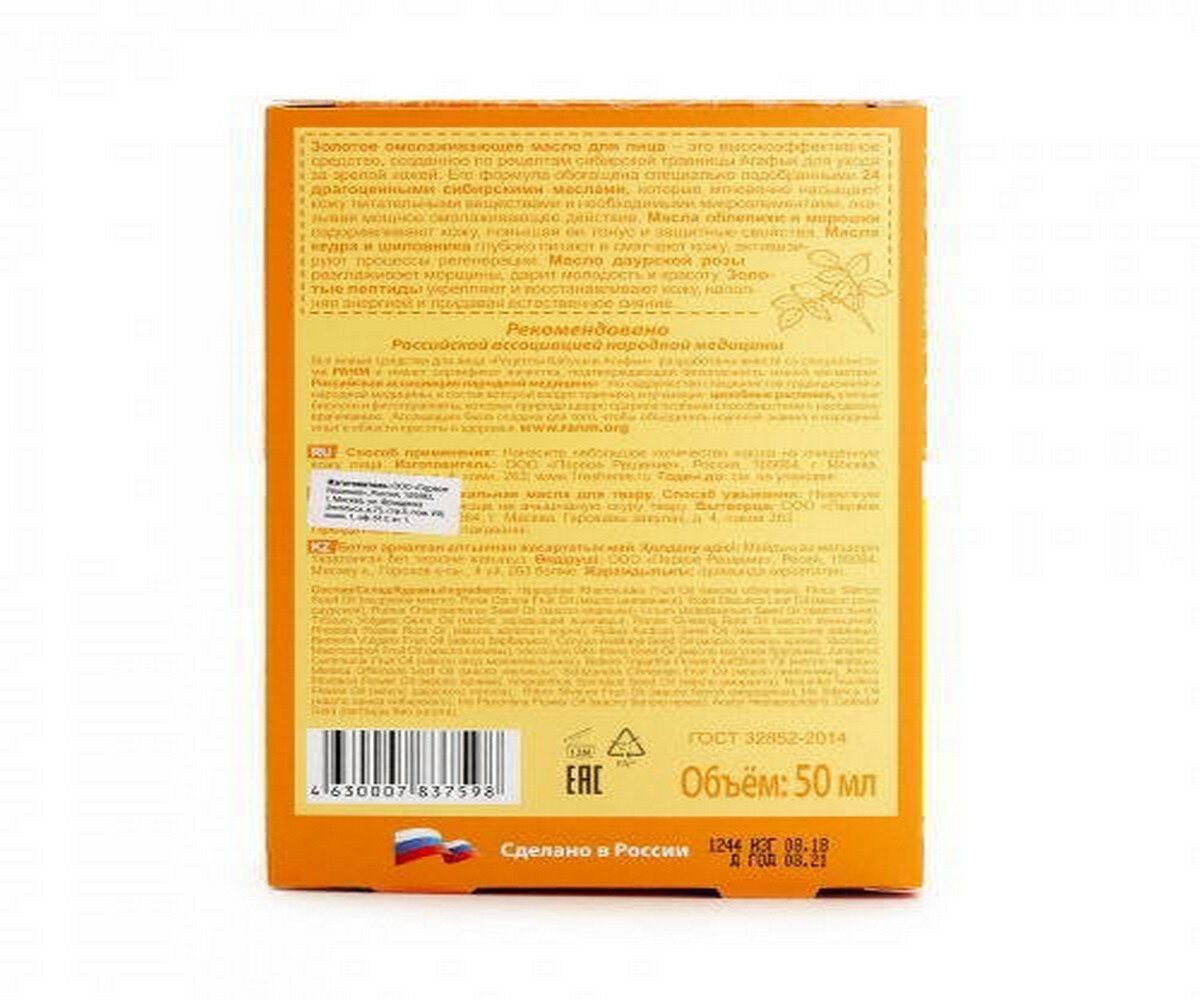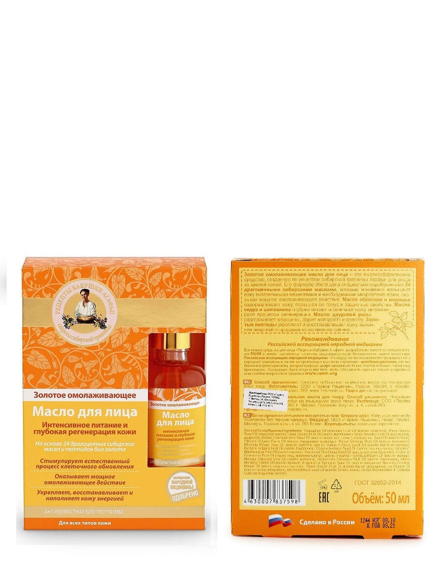Масло Рецепты бабушки Агафьи для лица золотое омолаживающее, 50 мл интересное: