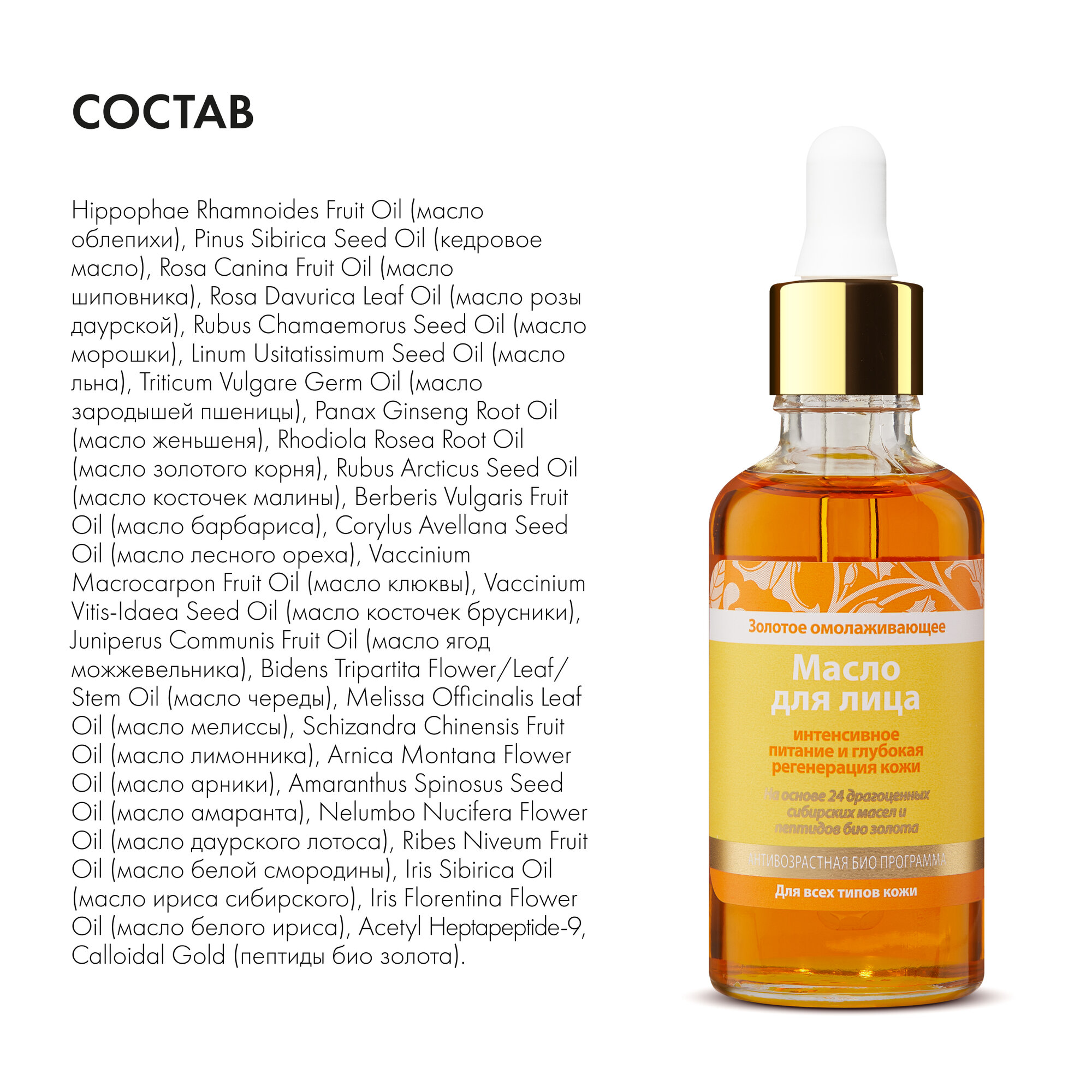 | Состав | Hippophae Rhamnoides Fruit Oil (масло облепихи), Pinus Sibirica Seed Oil (кедровое масло) |
