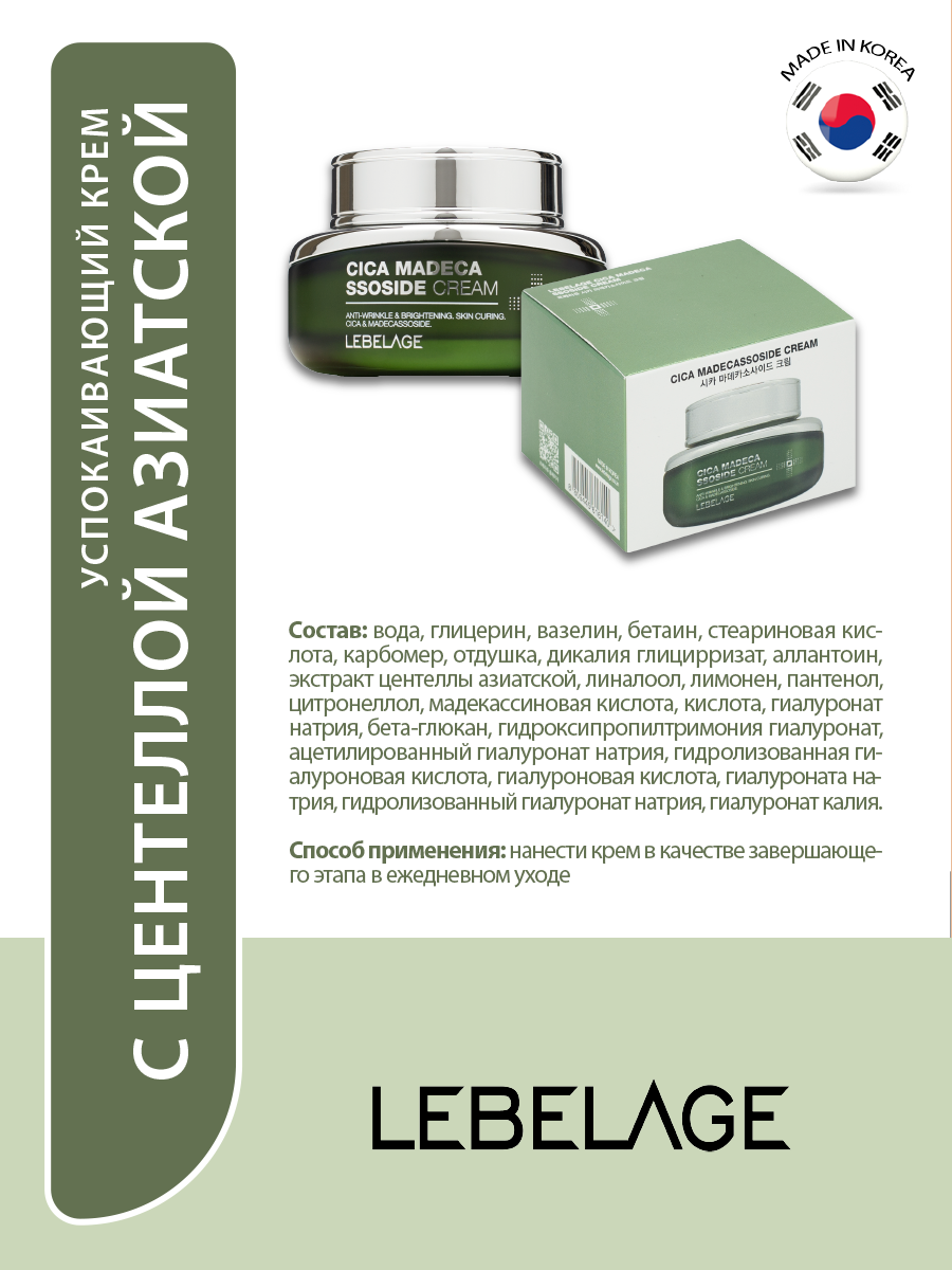 LEBELAGE Успокаивающий крем для ухода за кожей лица, шеи и зоны декольте против морщин с мадекассосидом, корейская косметика. 70мл