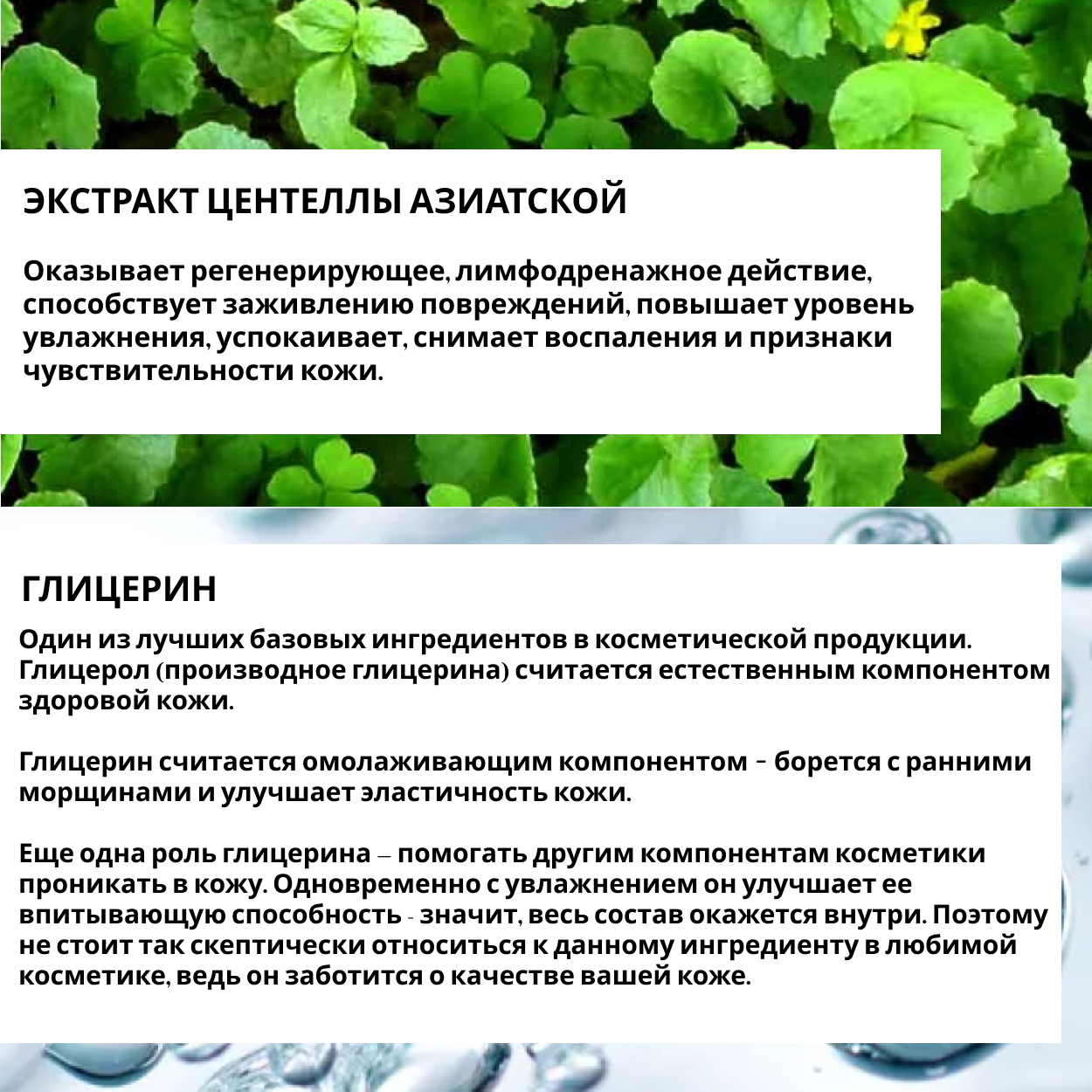 | Состав | Вода, экстракт центеллы азиатской, глицерин, пропиленгликоль, Глицерет-25, феноксиэтанол, Метилпарабен. Карбомер, триэтаноламин, гидроксиэтилцеллюлоза, гидрогенизированное касторовое масло Peg-40, Каприлгидроксамовая кислота, Отдушка динатриевая, гиалуронат натрия, Peg |