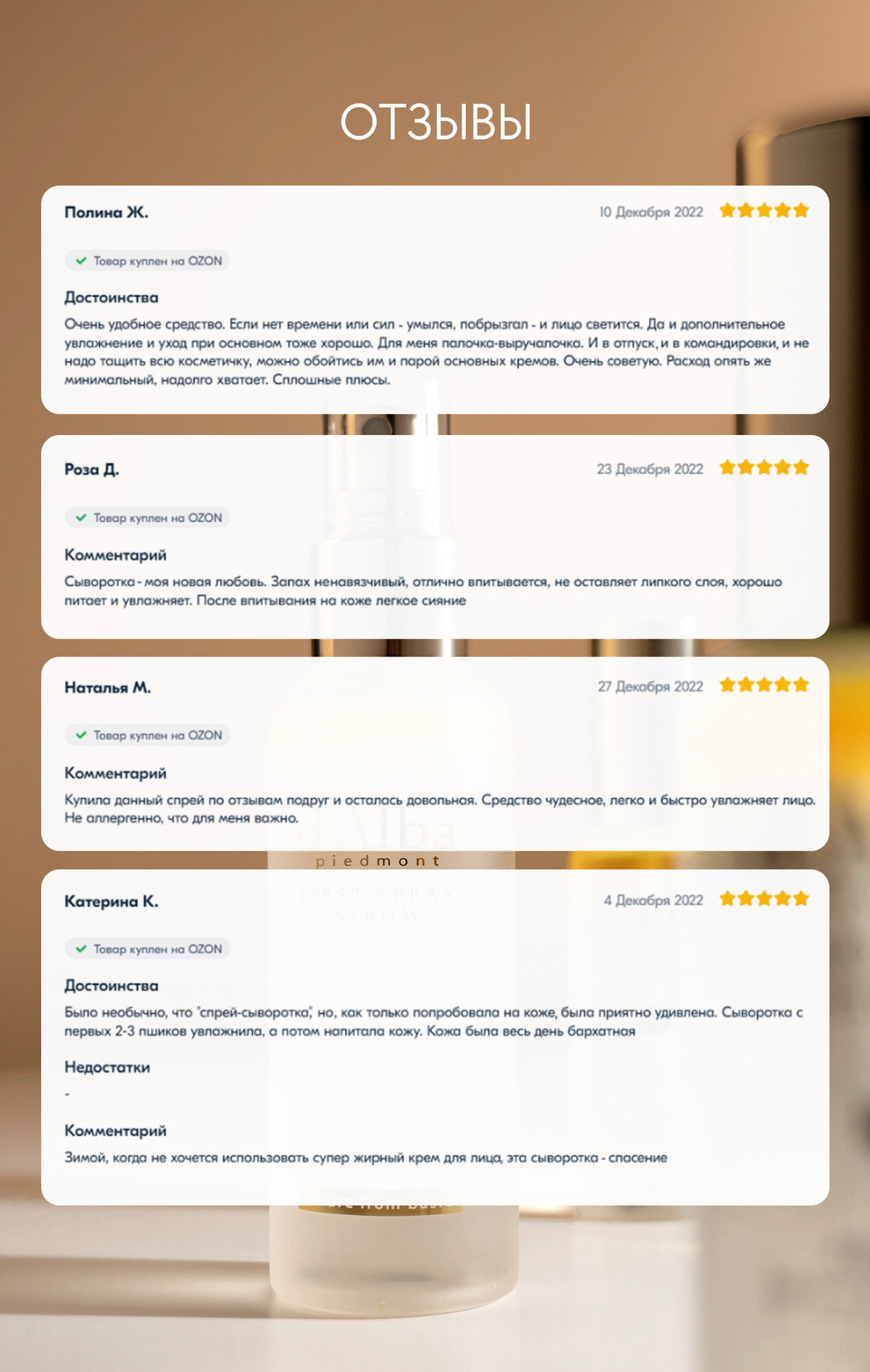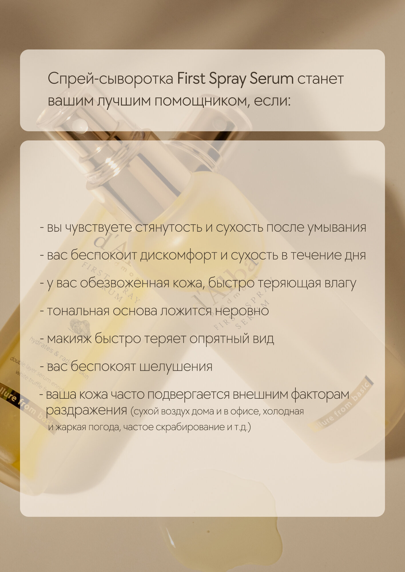 | Способ применения | встряхните перед использованием, чтобы слои сыворотки равномерно перемешались. Распылите небольшое количество средства на кожу лица и шеи с расстояния 10-20 см, предварительно закрыв глаза. Спрей-сыворотку можно использовать следующими способами: 1) сразу после умывания, чтобы предотвратить сухость и стянутость, 2) в качестве основного ухода (перед кремом), 3) дополнительно перед нанесением тонального крема в качестве подготовки к макияжу, 4) в течение для по мере необходимости (в качестве миста) |