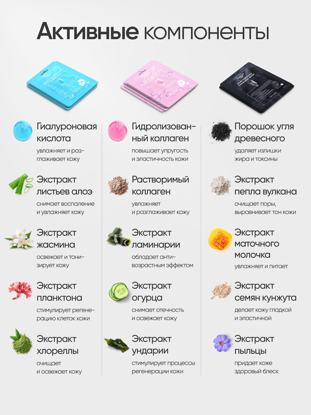 | Активный ингредиент | гиалуроновая кислота / коллаген / лецитин / уголь |