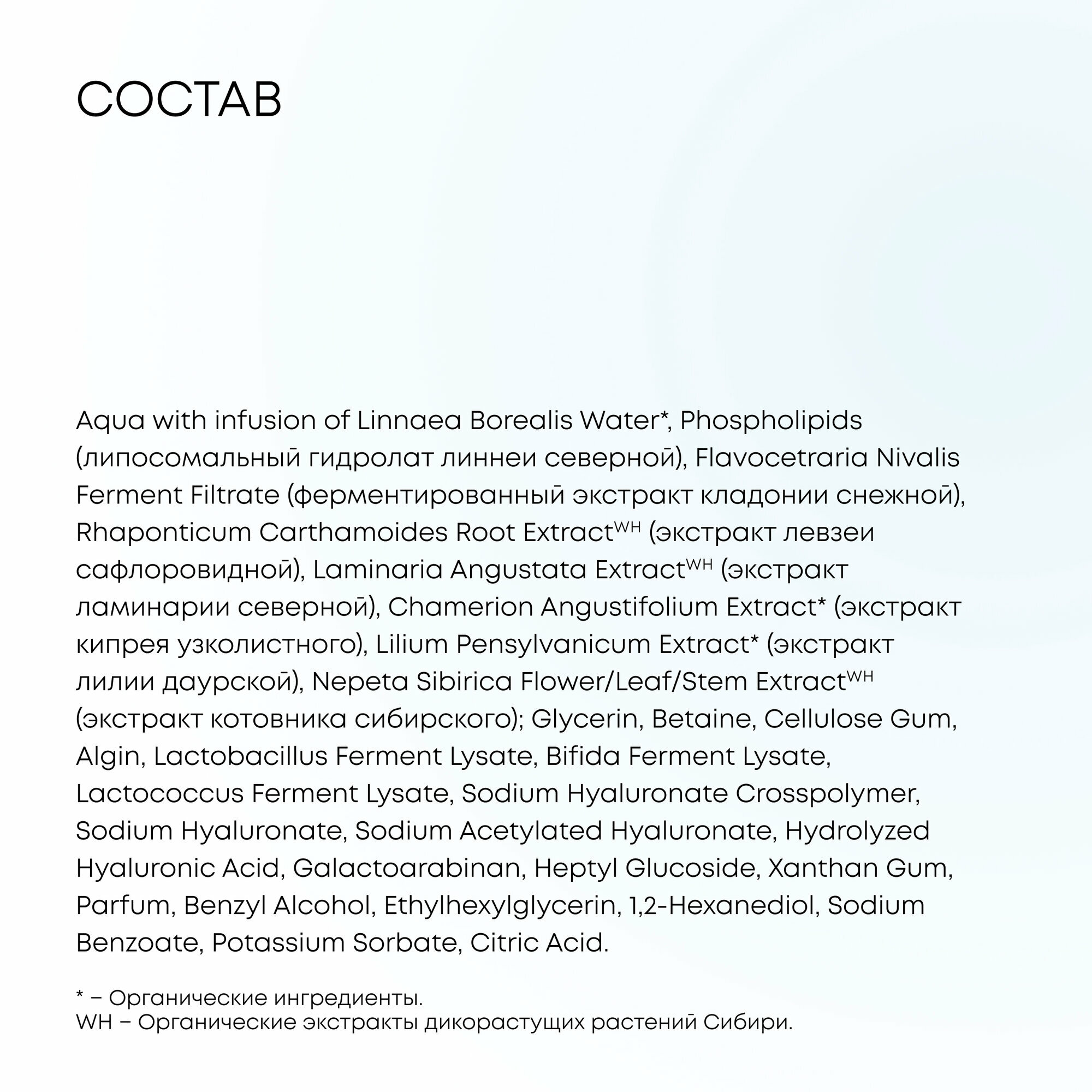 | Состав | Aqua with infusion of Linnaea Borealis Water*, Phospholipids (липосомальный гидролат линнеи северной), Flavocetraria Nivalis Ferment Filtrate (ферментированный экстракт кладонии снежной), Rhaponticum Carthamoides Root ExtractWH (экстракт левзеи сафлоровидной), Laminaria Angustata ExtractWH (экстракт ламинарии северной), Chamerion Angustifolium Extract* (экстракт кипрея узколистного), Lilium Pensylvanicum Extract* (экстракт лилии даурской), Nepeta Sibirica Flower/Leaf/Stem ExtractWH (экстракт котовника сибирского); Glycerin, Betaine, Cellulose Gum, Algin, Lactobacillus Ferment Lysate, Bifida Ferment Lysate, Lactococcus Ferment Lysate, Sodium Hyaluronate Crosspolymer, Sodium Hyaluronate, Sodium Acetylated Hyaluronate, Hydrolyzed Hyaluronic Acid, Galactoarabinan, Heptyl Glucoside, Xanthan Gum, Parfum, Benzyl Alcohol, Ethylhexylglycerin, 1,2-Hexanediol, Sodium Benzoate, Potassium Sorbate, Citric Acid. * − Органические ингредиенты. WH − Органические экстракты дикорастущих растений Сибири. |
