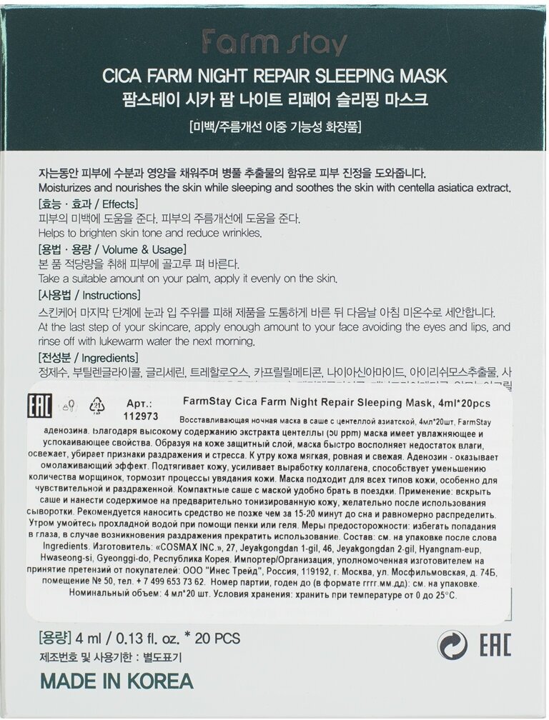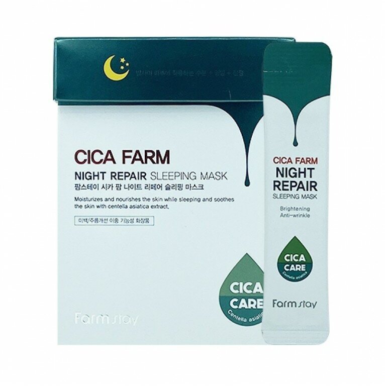 FarmStay Восстанавливающая ночная маска лица в саше с центеллой азиатской. Корея, Cica Farm Night Repair Sleeping Mask. Уходовая корейская косметика. 20 шт по 4 мл интересное: