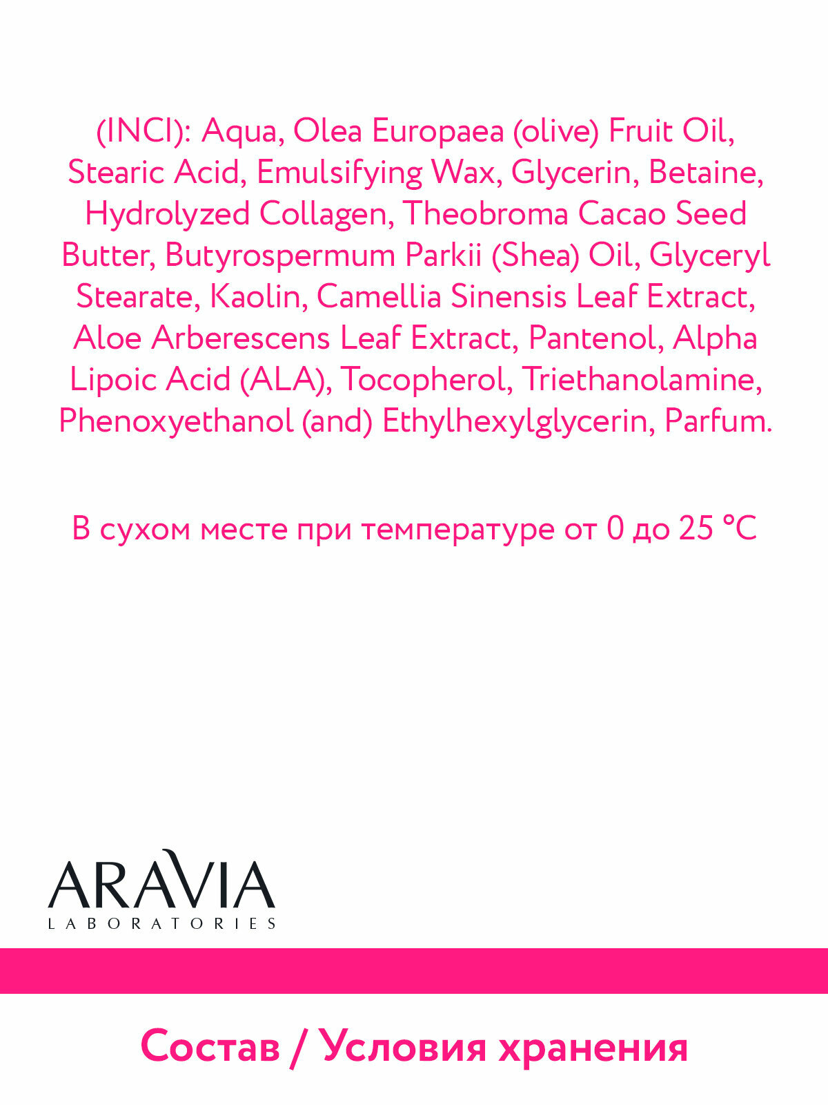 | Состав | Aqua, Olea Europaea (olive) Fruit Oil, Stearic Acid, Emulsifying Wax, Glycerin, Betaine, Hydrolyzed Collagen, Theobroma Cacao Seed Butter, Butyrospermum Parkii (Shea) Oil, Glyceryl Stearate, Kaolin, Camellia Sinensis Leaf Extract, Aloe Arberescens Leaf Extract, Pantenol, Alpha Lipoic Acid (ALA), Propylene Glycol, Tocopherol, Triethanolamine, ВНТ, Parfum |