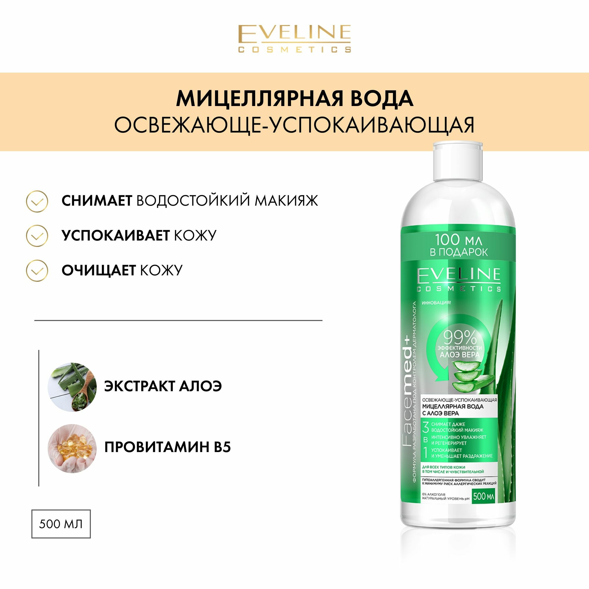 Мицеллярная вода EVELINE FACEMED+ 3 в 1 с алоэ вера освежающе-успокаивающая 500 мл интересное: