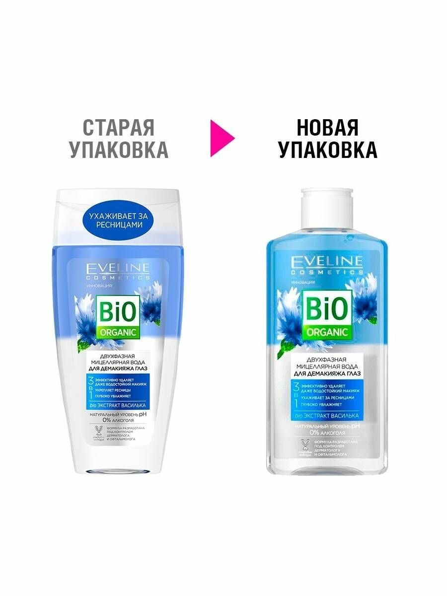 EVELINE Мицеллярная вода BIO ORGANIC двухфазная 3 в 1 для демакияжа глаз с экстрактом василька 150 мл