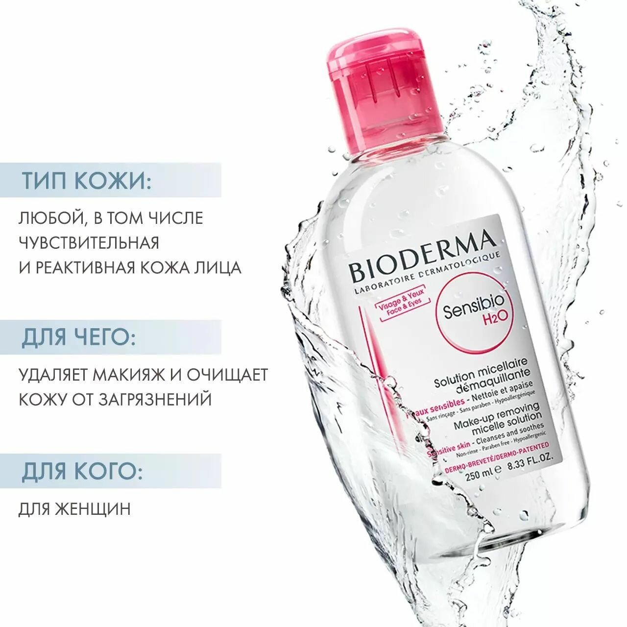 | Способ применения | нанесите Сенсибио Н2О на ватный диск. Аккуратно протрите кожу лица и контур глаз пока диск не будет чистым. После применения промокните лицо бумажным полотенцем |