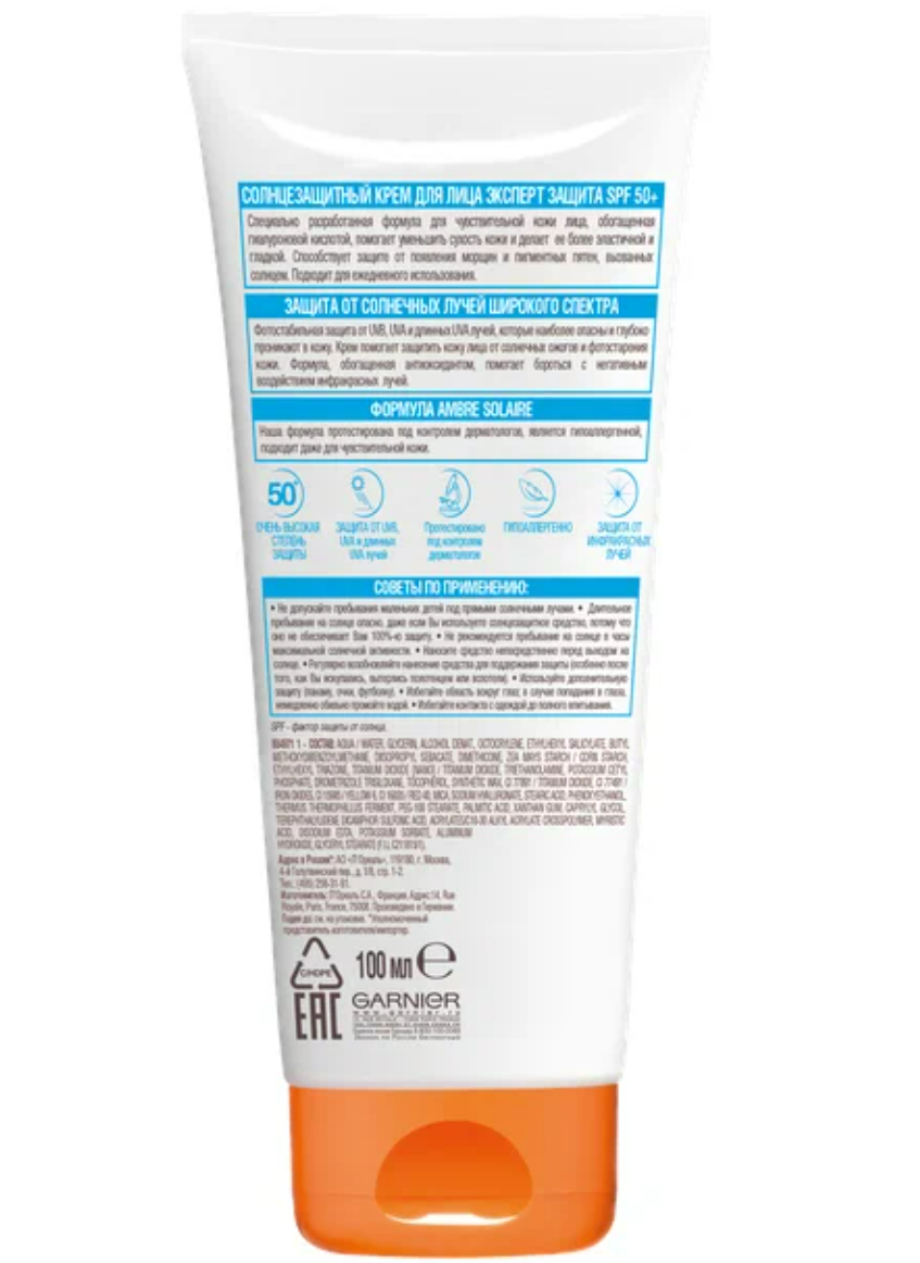 GARNIER крем Ambre Solaire Эксперт защита SPF 50, 100 мл интересное: