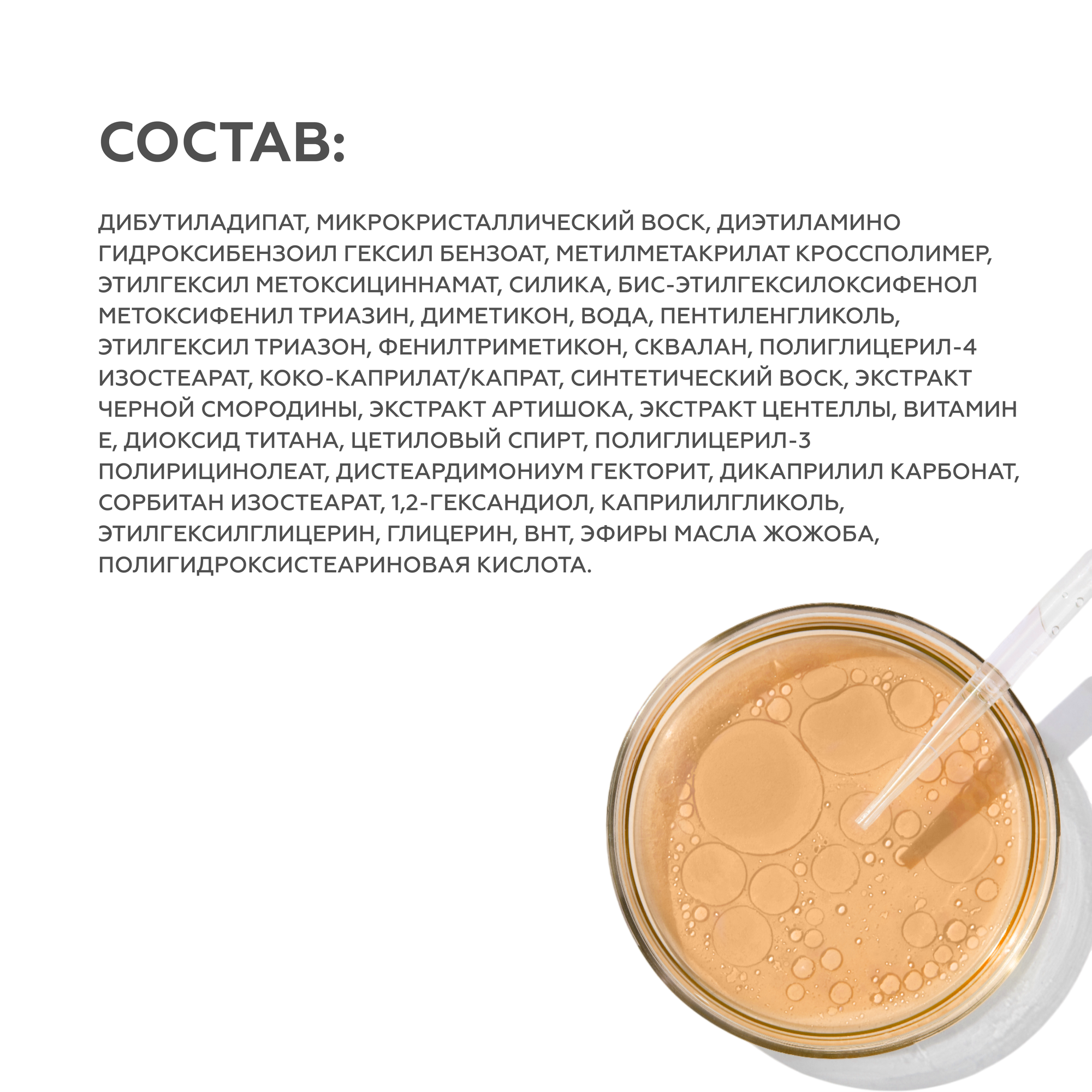 | Состав | вода очищенная, этилгексил метоксициннамат, гомосалат, диэтиламино гидроксибензоил гексил бензоат, полиглицерил-3 метилглюкозы дистеарат, метилен бис-бензотриазолил тетраметилбутилфенол (нано), глицерил стеарат SE, диоксид титана (нано), силика, цетеарил оливат, сорбитан оливат, этилгексил триазон, фукогель, ПЭГ-40 гидрогенизированное касторовое масло, ксантановая камедь, аристофлекс, амигель, децил глюкозид, пропиленгликоль, тиногард ТТ, лимонная кислота, жермабен II, отдушка |