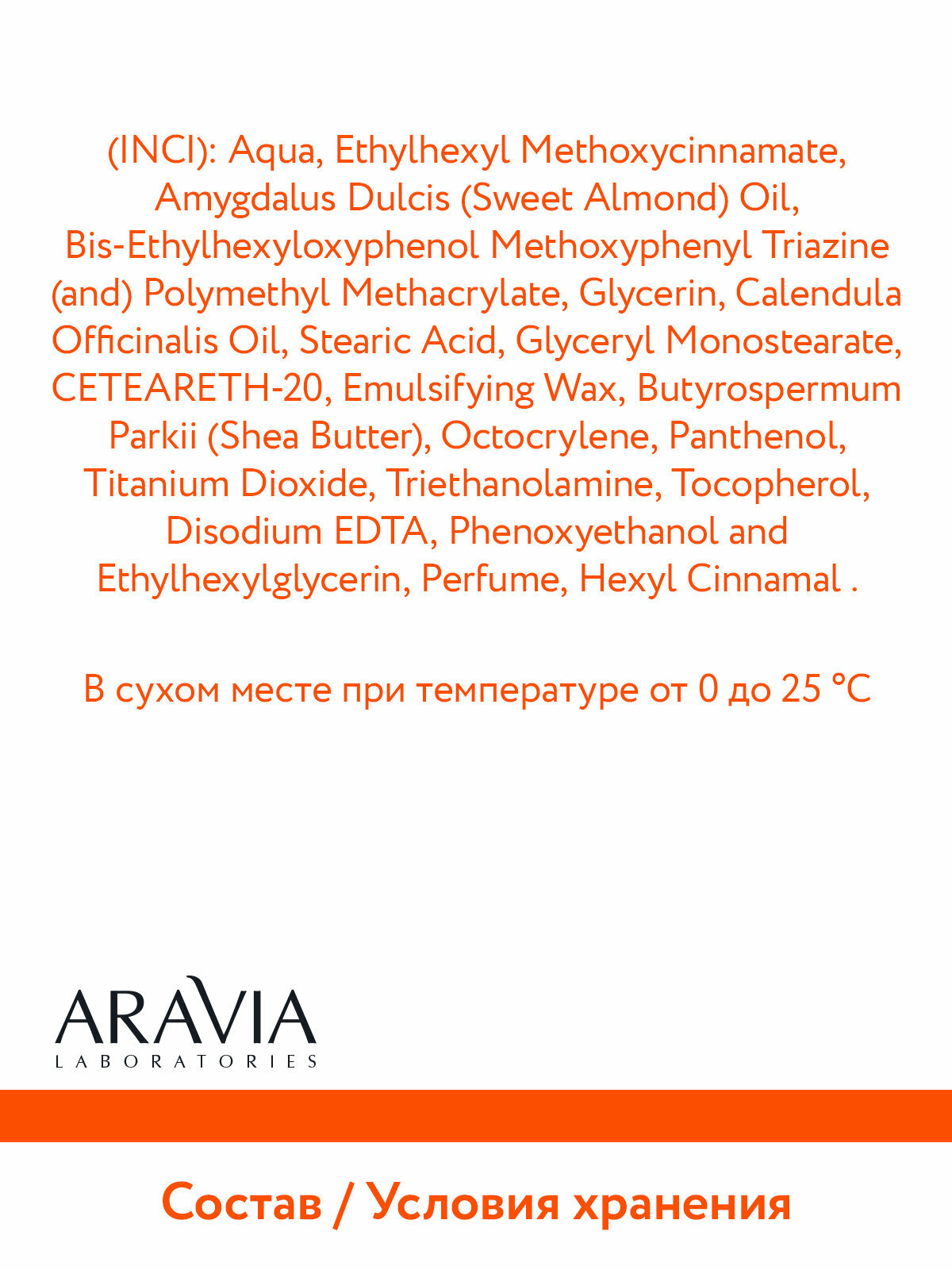 | Состав | Aqua, Ethylhexyl Methoxycinnamate, Amygdalus Dulcis (Sweet Almond) Oil, Bis-Ethylhexyloxyphenol Methoxyphenyl Triazine (and) Polymethyl Methacrylate, Glycerin, Calendula Officinalis Oil, Stearic acid, Glyceryl Monostearate, Ceteareth-20, Emulsifying Wax, Butyrospermum Parkii (Shea Butter), Octocrylene, Panthenol, Titanium Dioxide, Triethanolamine, Tocopherol, Disodium EDTA, Perfume, Hexyl Cinnamal |