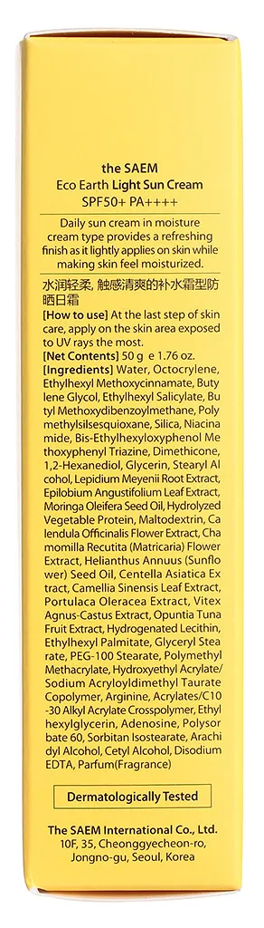 Солнцезащитный крем The SAEM Eco Earth Light Sun Cream SPF 50+ PA++++ (50г.) интересное: