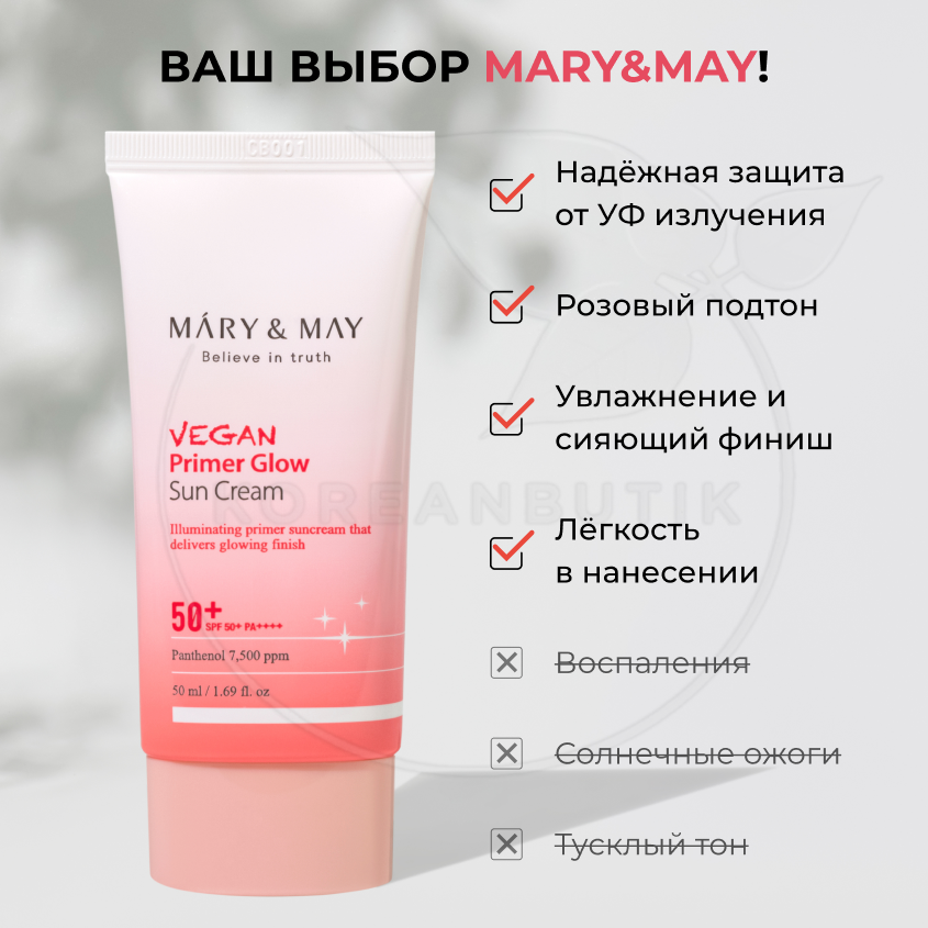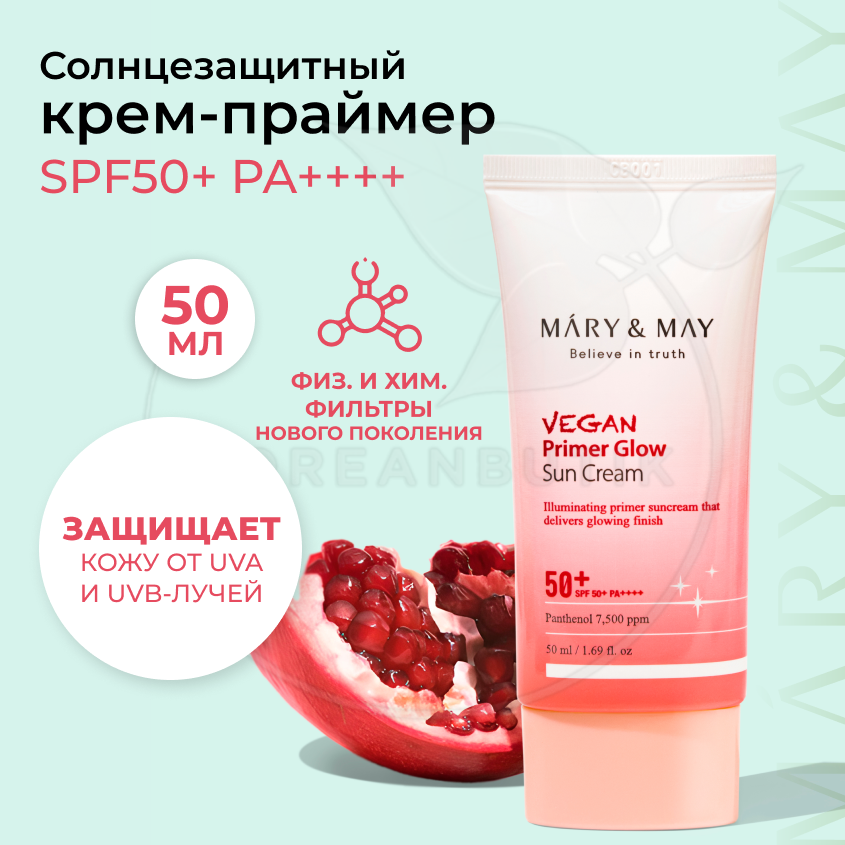 Крем-праймер cолнцезащитный | Mary & May Vegan Primer Glow Sun Cream SPF50+ PA++++ 50ml интересное: