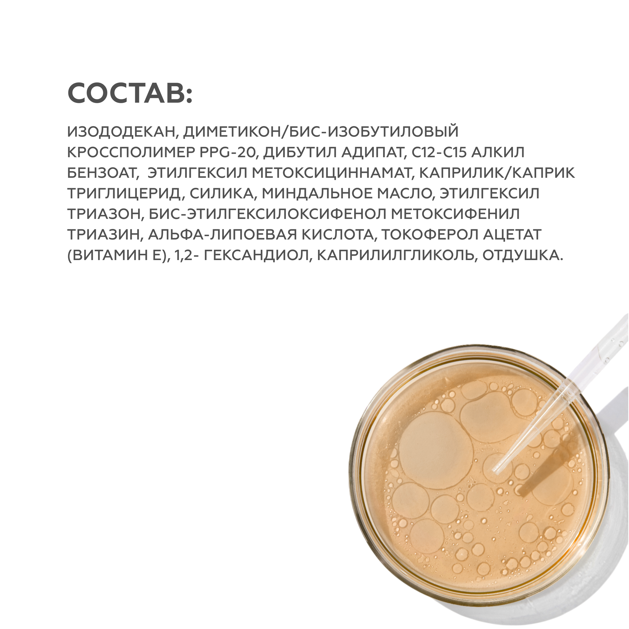 | Состав | изододекан, диметикон/бис-изобутиловый кроссполимер PPG-20, коко-каприлат, каприлик/каприк триглицерид, этилгексилметоксициннамат, миндальное масло, силика, этилгексилтриазон, бис-этилгексилоксифенол метоксифенил триазин, альфа-липоевая кислота (из листьев дерева Ним), токоферол ацетат (витамин Е), 1,2- гександиол, каприлилгликоль, отдушка |