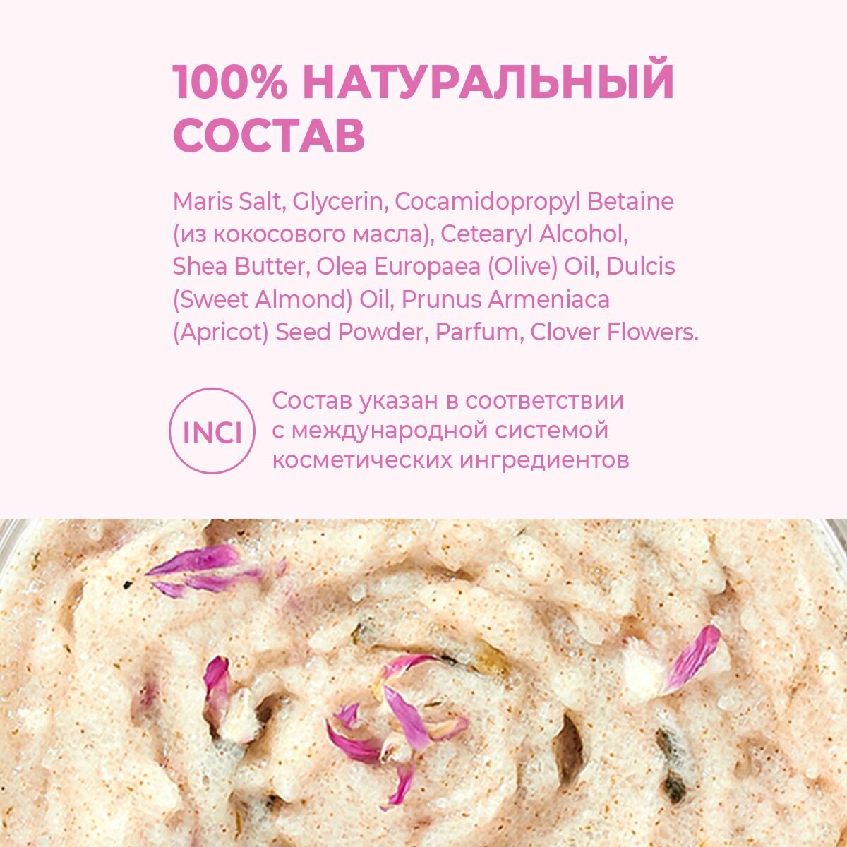 | Состав | Масло Ши, Оливковое масло, Масло сладкого миндаля, Порошок абрикосовых косточек, Отдушка, Цветы клевера, Масло эвкалипта, Льняное масло, Масло виноградной косточки, Масло грецкого ореха, Оливковое масло |