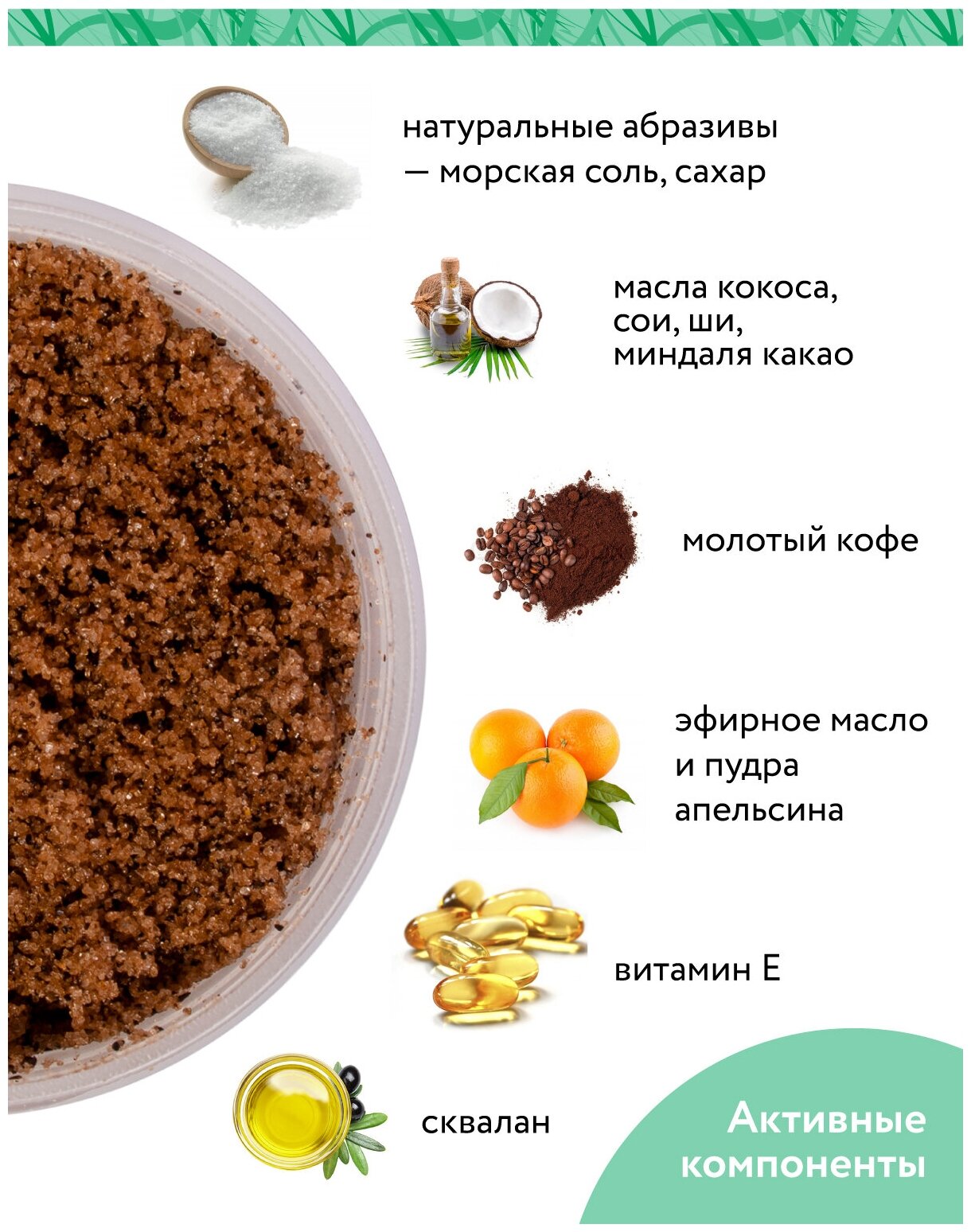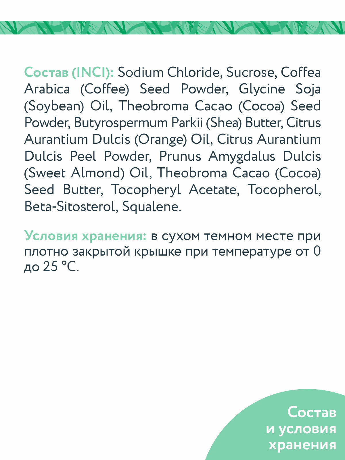 | Состав | Sodium Chloride, Sucrose, Coffea Arabica (Coffee) Seed Powder, Glycine Soja (Soybean) Oil, Theobroma Cacao (Cocoa) Seed Powder, Butyrospermum Parkii (Shea) Butter, Citrus Aurantium Dulcis (Orange) Oil, Citrus Aurantium Dulcis Peel Powder, Prunus Amygdalus Dulcis (Sweet Almond) Oil, Theobroma Cacao (Cocoa) Seed Butter, Tocopheryl Acetate, Tocopherol, Beta-Sitosterol, Squalene |