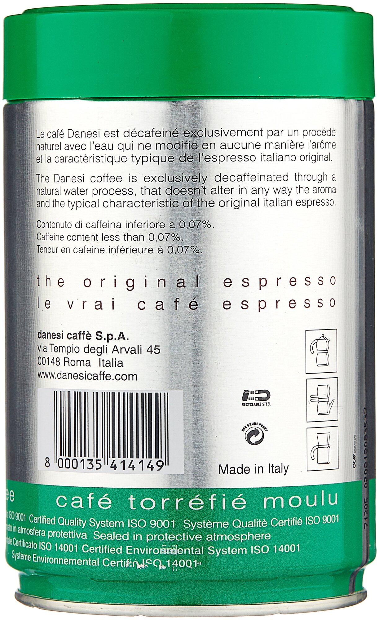 Кофе молотый Danesi Decaf (Эспрессо без кофеина), ж/б, 250гр