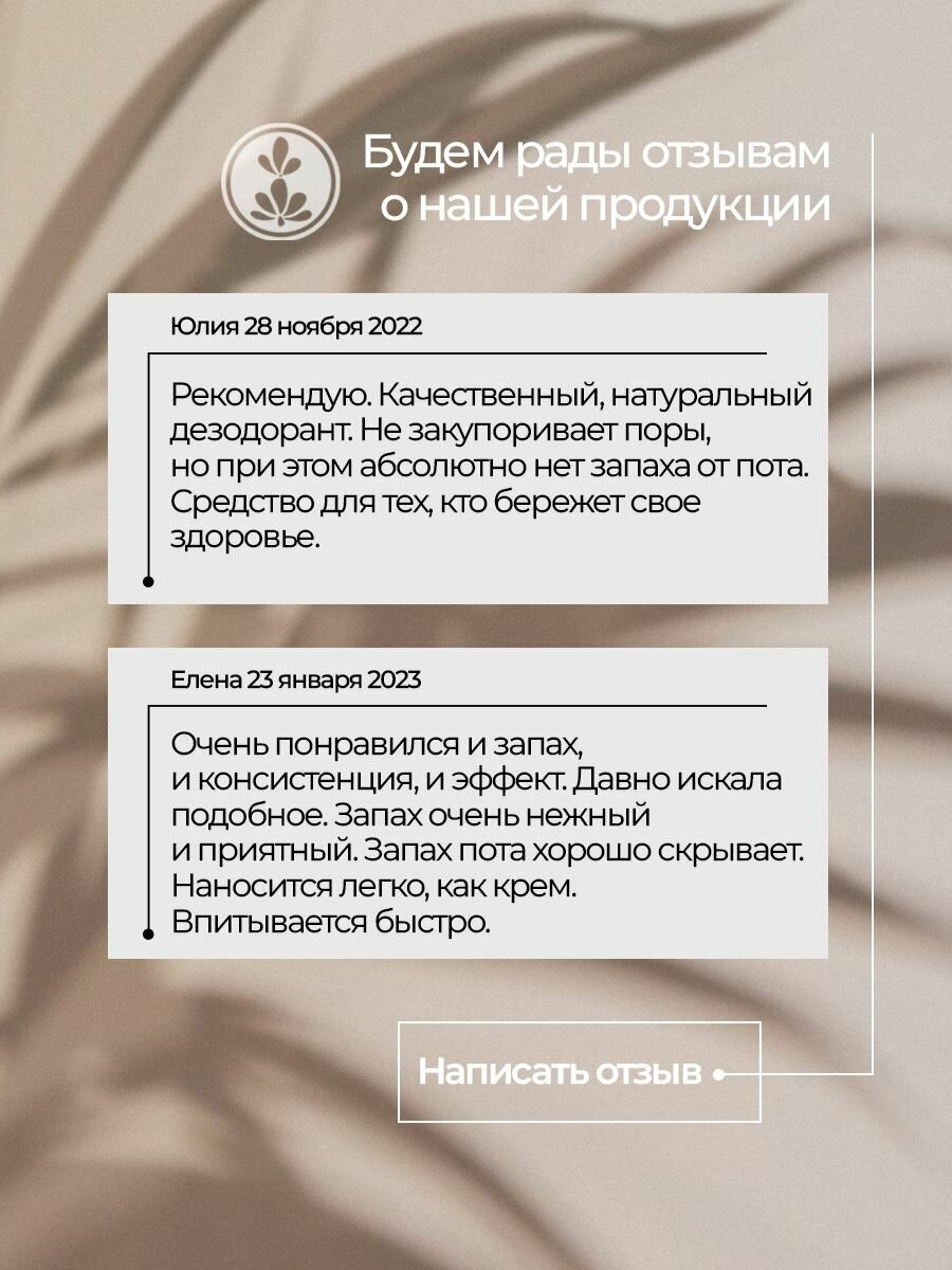 | Дополнительная информация | Натуральные ингредиенты, безопасный состав, не блокирует работу потовых желез, ухаживает за кожей |