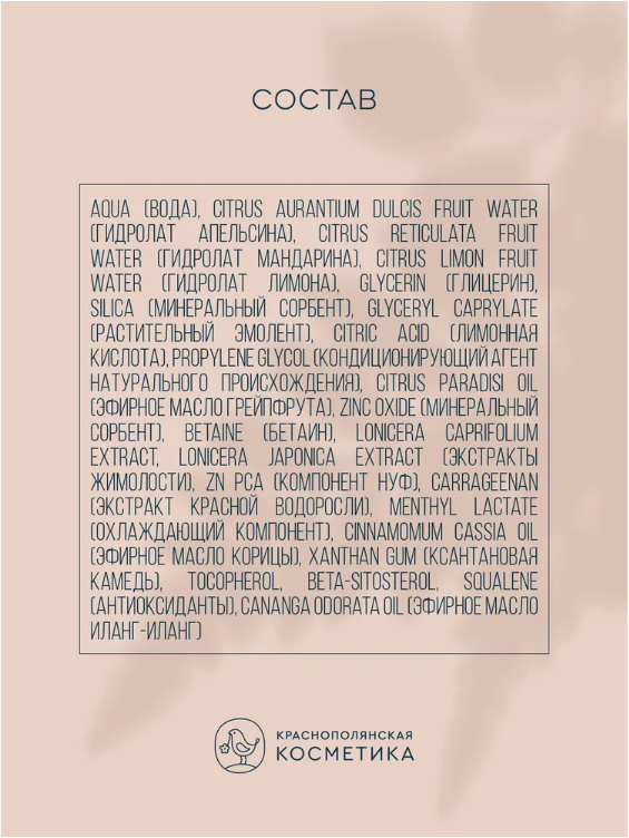 | Полный состав | Aqua (Вода), Lavandula Angustifolia Flower Water (Гидролат лаванды), Potassium Alum (Алюмокалиевые квасцы), Glycerin (Глицерин), Glyceryl Caprylate (Растительный эмолент), Silica (Минеральный сорбент), Propylene Glycol (Кондиционирующий агент натурального происхождния), Zn PCA (Компонент НУФ), Betaine (Бетаин), Lavandula Angustifolia Oil (Эфирное масло лаванды), Corn Starch (Кукурузный крахмал), Sodium Bicarbonate (Сода пищевая), Menthyl Lactate (Охлаждающий агент), Xanthan Gum (Ксантановая камедь), Tocopherol (and) Beta-Sitosterol (and) Squalene (Антиоксиданты). |